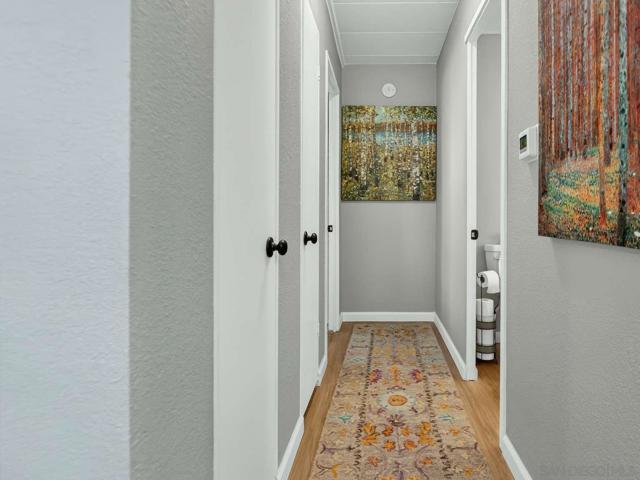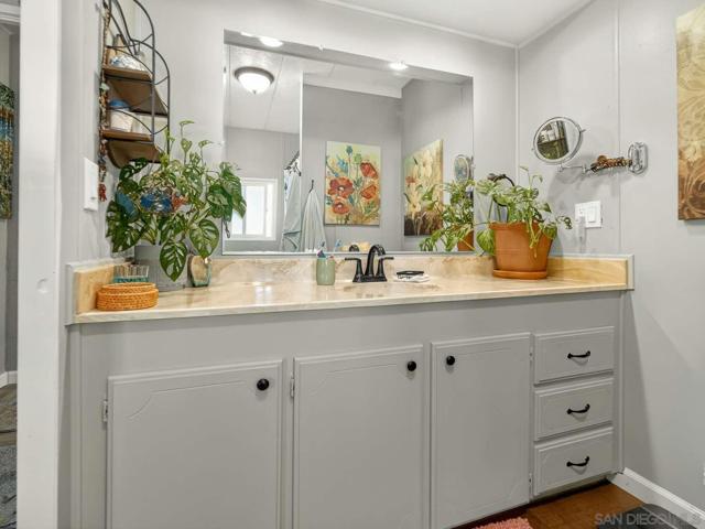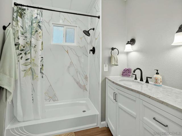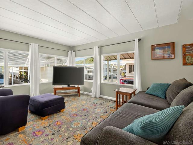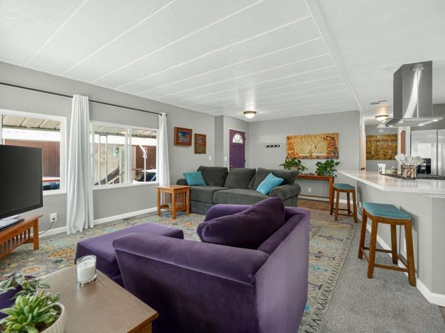 Beautifully remodeled 2 bedroom,1056 sq ft home located in one of East County’s most desirable resident-owned 55+ communities. This well-managed, gated, and impeccably maintained neighborhood includes a dog park, a year-round 89 degree heated pool and spa, and many clubhouse activities. With the lowest refundable buy-in in the area ($6200) and a monthly space rent of $630, this park is one of the most affordable resident-owned parks in San Diego County. In 2025, the home’s roof was resealed, it was painted inside and out, (including texturized interior walls), had all new flooring and carpeting installed, all new shaker kitchen cabinets, a kitchen island and quartz countertops installed, a new front bath remodel, and both outside stairs re-carpeted. All appliances convey. All windows are vinyl double-paned. There has been extra roof and wall insulation put in (per previous listing), all electrical outlets have been pigtailed with copper, and the plumbing has all been replaced with PEX. The A/C and hot water heater are both only 7 years old (2019), and the hot water heater, A/C, and heater were all checked by San Diego's main utility company approx. 6 months ago. The yard is low maintenance and graveled and had French drains installed, the driveway has been widened and fits 2-3 cars with a small shed included, and the home is still under a termite warranty until February 2027. In addition, this home has no property taxes! It’s on registration--approximately $70 a year! Come see this beautifully remodeled home 10 minutes from shopping, and only 30 minutes to the coast!