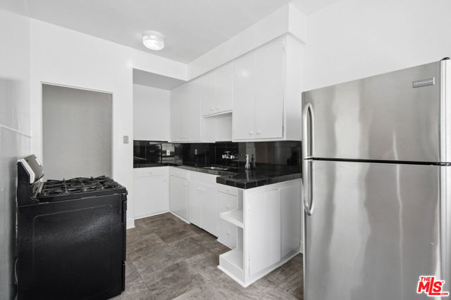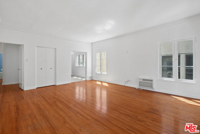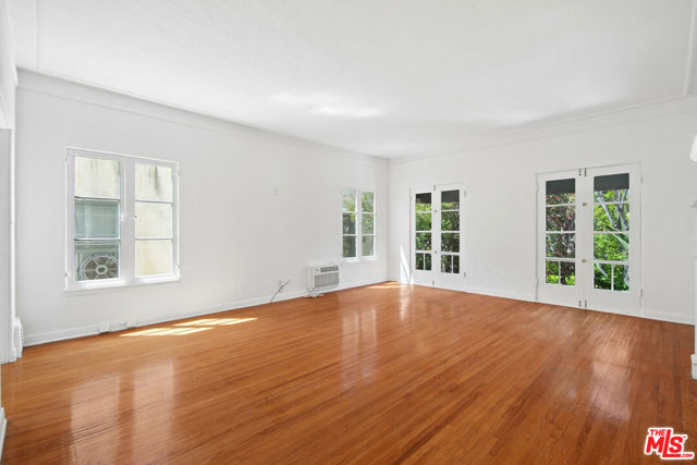Spacious top-floor 1-bedroom, 1-bath unit in prime Beverly Hills featuring hardwood floors throughout, a large living room with abundant natural light, and wall A/C units. The kitchen includes white cabinetry, gas range, stainless steel refrigerator, and a separate dining area. Generously sized bedroom with mirrored closet doors and ceiling fan. Classic tile bathroom with full tub. On-site laundry. Pets allowed. Tenant pays gas, electric, and trash. Water included. Permit street parking available. Conveniently located near Rodeo Drive, Beverly Drive, Wilshire Blvd, shopping, dining, parks, and grocery stores. Square footage is approximate and not verified.