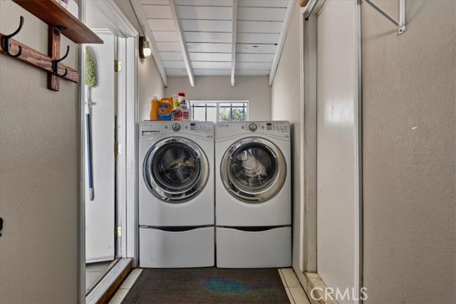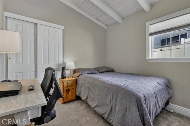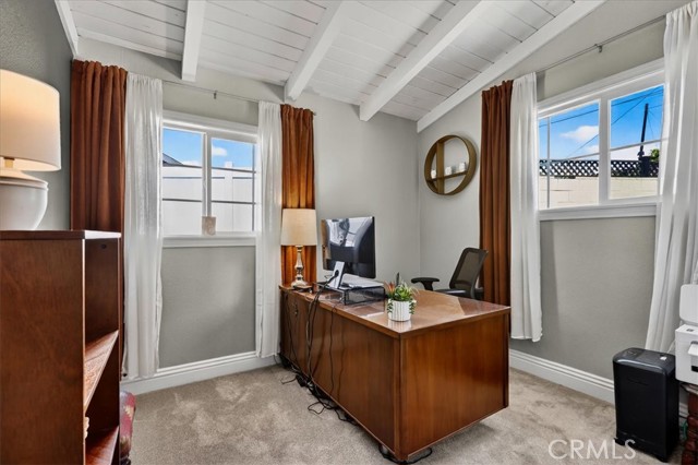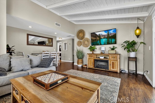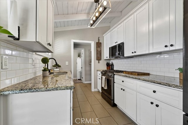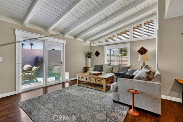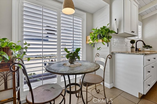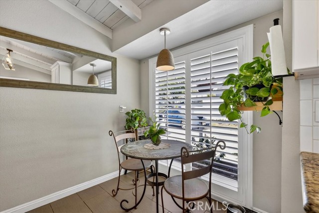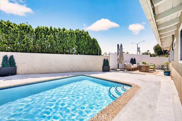 Beautiful pool home tucked away on a quiet cul-de-sac greets you with undeniable curb appeal. Lush green grass, thoughtful rockscape, and a welcoming path lead you to the front door. Step through the private entry into a hallway, where a doorway opens to the kitchen and another doorway leads to a convenient three-quarter bath. The space then flows seamlessly into the bright dining area and expansive living room. The galley kitchen is both stylish and functional, featuring white cabinetry, classic white subway tile backsplash, and stainless steel appliances from Samsung and LG. A charming breakfast nook adjacent to the kitchen is illuminated by a stunning floor-to-ceiling window. A hidden pantry tucked behind the kitchen offers additional storage and organization. The living room is bathed in natural light, thanks to transom windows, large dual-pane windows, and a sliding glass door that opens directly to the backyard creating a seamless indoor-outdoor flow. All bedrooms are generously sized and feature newer carpet. Three of the bedrooms are enhanced with custom closet organizers. Throughout the home, charming exposed vaulted ceilings add character and a sense of spaciousness. The living room and primary bedroom are further elevated with custom shutters. Step outside to the private backyard oasis, designed for low-maintenance enjoyment. A sparkling pool with a heater invites year-round relaxation, while the surrounding concrete keeps upkeep simple. Large planters line the perimeter, ready for your personal touch, and recently installed white vinyl fencing offers privacy and a clean, modern look. Recent updates include dual-pane windows throughout, newer water heater and AC unit, and smart home outlets installed for modern convenience. The property is located very close to award winning schools, many parks, Biola University, La Mirada Golf Course, Splash, and steps away from a large shopping center with a UFC gym, movie theater, multiple dining options, and La Mirada Theater For The Performing Arts! Your La Mirada dream home is waiting, make this one yours!
