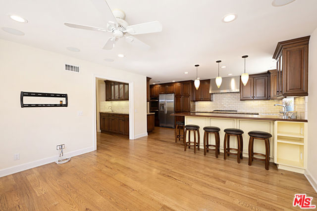 WELCOME TO ONE OF THE LARGEST TOWNHOMES IN THE PACIFIC PALISADES HIGHLANDS! This tranquil end unit "Villa" is a slice of paradise, and feels like a single-family residence, with spectacular unobstructed mountain and canyon views and an abundance of natural light throughout. As you enter, you are welcomed by a spacious living room with vaulted ceilings and a fireplace. Immediately adjacent is a large private patio (with a dedicated gas line) which is ideal for a barbeque and outdoor furniture. This home also has a separate dining area, wet bar, guest bathroom, and chef's kitchen with its own sitting area which is perfect for relaxing and entertaining. This portion of the unit has been remodeled and redesigned with an open concept and includes hardwood floors, solid doors with new hardware and trim, custom cabinetry, granite countertops, custom/LED lighting, stainless steel appliances (including dual ovens and dual dishwashers), a small custom elevator which can be used to carry groceries directly to the kitchen from a private garage, and surround sound speakers which are pre-wired in the sitting area. All three bedrooms are upstairs and include a spacious and serene primary bedroom with a fireplace, wrap around balcony with mountain and canyon views, vaulted ceilings, a walk-in and additional closet, an en-suite bathroom with dual sinks, a bathtub and a remodeled shower. The second bedroom includes a walk-in closet and shares a bathroom with the third bedroom. Additional features on the upper level include new carpeting, upgraded solid doors with new hardware and trim, as well as a wonderful skylight. On the ground floor there is direct access to a private two car garage, a recently purchased washer and dryer (included w/sale), and a bonus room which is perfect for a home office, wine room, yoga/gym space, playroom, or additional storage. In addition to 24-hour security patrol, the HOA is surrounded by lush and mature landscaping and includes a swimming pool and spa, dry saunas, and a fitness room. FURNISHED PHOTOS ARE VIRTUALLY STAGED.