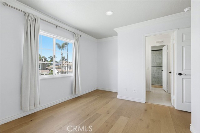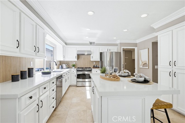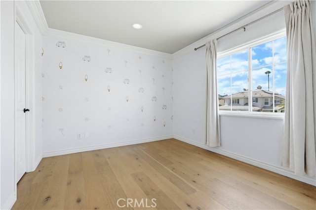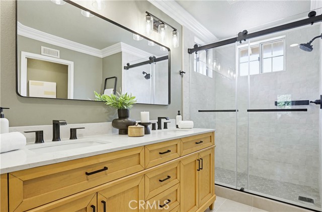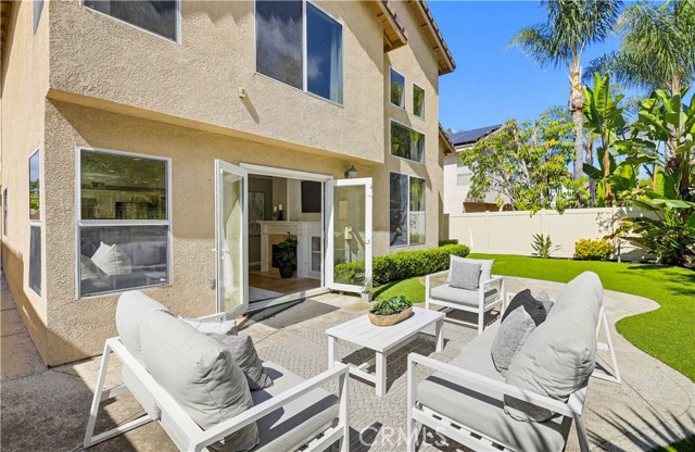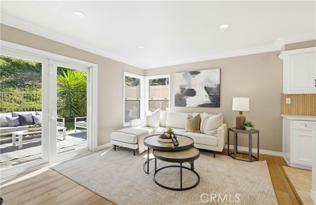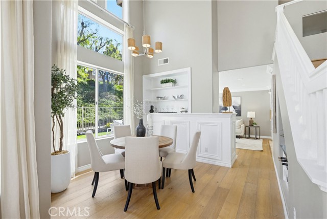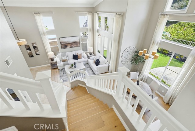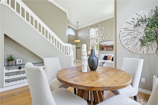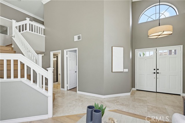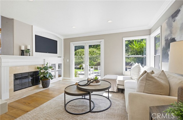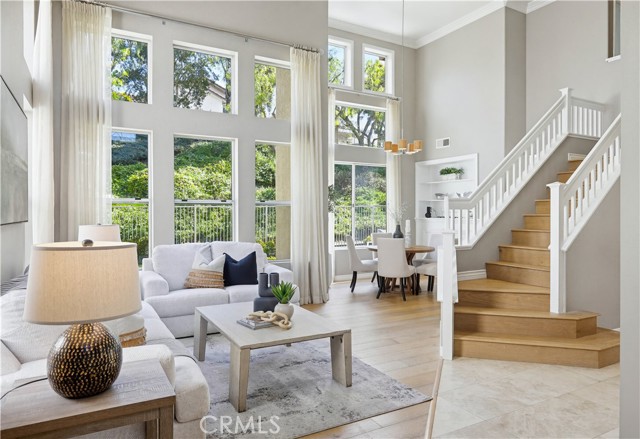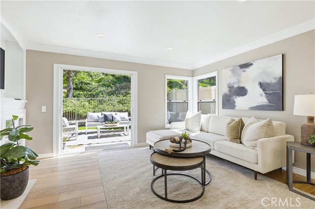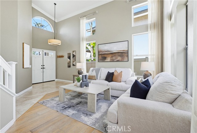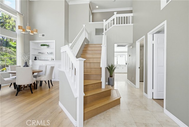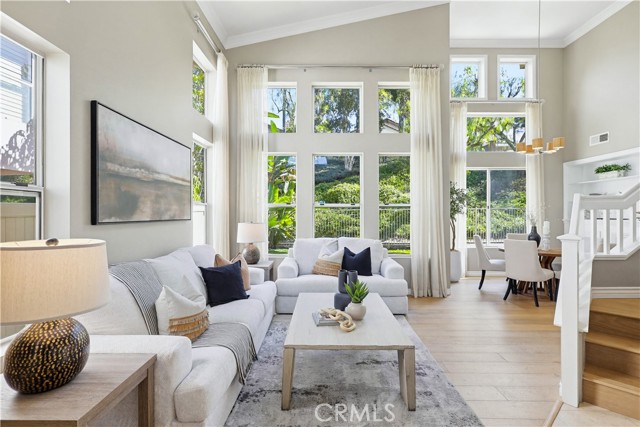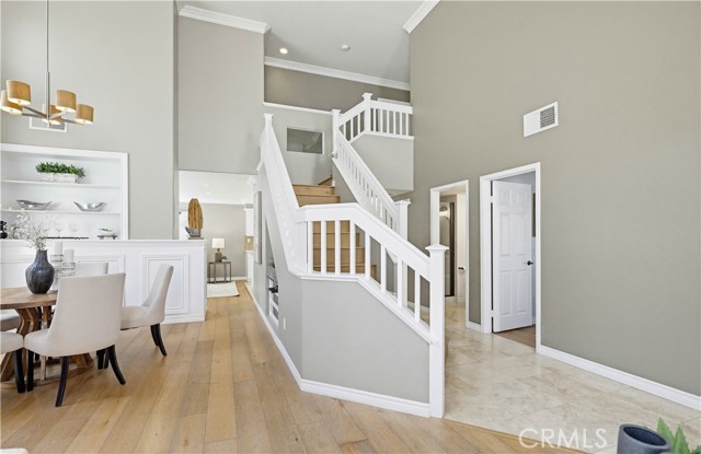 Prepare to fall in love with this spacious and beautifully updated California Crest home, a perfect example of pride in ownership! Ideally located on a family friendly cul-de-sac street in a highly desirable Pacific Hills neighborhood, this home pushes all the right buttons! Pass through the double door entry and soak in the soaring two story ceilings with an abundance of natural light streaming through the floor to ceiling windows. Extra wide crown molding, gorgeous wide plank wood floors, custom light fixtures, and a stunning centerpiece staircase set the stage for an impressive living environment. The formal living area is open to the formal dining room which features built-in cabinetry and wine rack, providing an elegant setting for dining and entertaining. Pass through to the sunny Kitchen which is open to the family room with built-in media center, cozy fireplace, and French doors opening to the backyard patio, a perfect indoor-outdoor living space. The beautifully updated and spacious kitchen features Quartz countertops and a stylish backsplash, timeless white cabinetry, Stainless-Steel appliances, and a prized center prep island with breakfast bar. The main level includes a stunning full bathroom with walk-in shower and a desirable bonus room perfect for a 4th bedroom or an executive home office with built-in bookcases and workstation. Travel up the light filled staircase to the large primary bedroom suite featuring vaulted ceilings, crown molding, two closets including a walk-in closet with built-in organizers, and a newly remodeled primary bath with custom Quartz topped dual vanity, new faucets and fixtures, a framed vanity mirror, updated lighting, and a large walk-in shower with custom tile surround and frameless glass enclosure. Two spacious upstairs guest bedrooms share a recently remodeled Jack & Jill bathroom. The sunny, low maintenance backyard is a peaceful oasis overlooking a lush greenbelt, perfect for relaxing with friends and family! The direct access 3 car garage features epoxy floors and an abundance of built-in storage cabinetry. Additional fine features and key details include a cost saving OWNED Solar System, repiped plumbing with PEX in 2025, the wood flooring installed and the Kitchen updated in 2022, and bathrooms remodeled in March of this year. Lake Mission Viejo membership, Low HOA dues, and No Mello Roos! Close to local schools, and just a short stroll to Pacific Hills Park.
