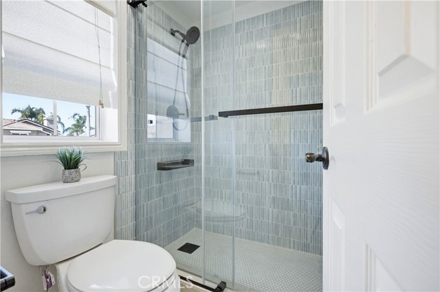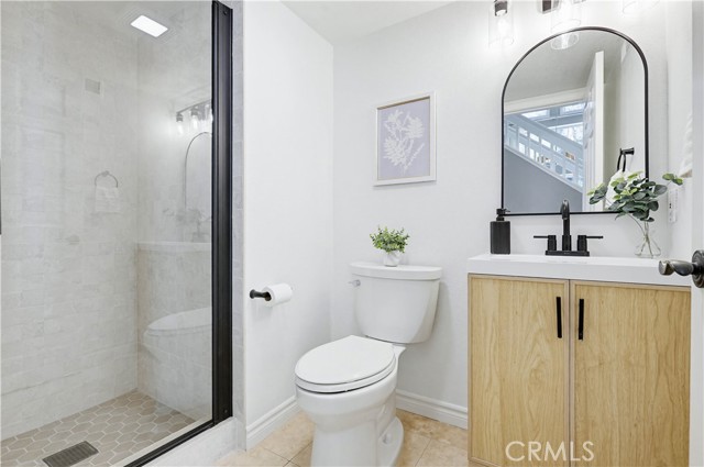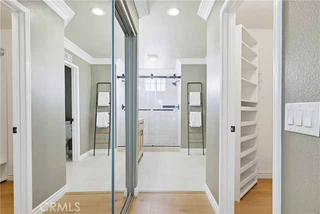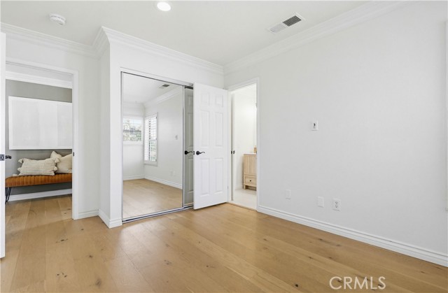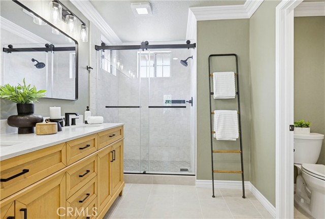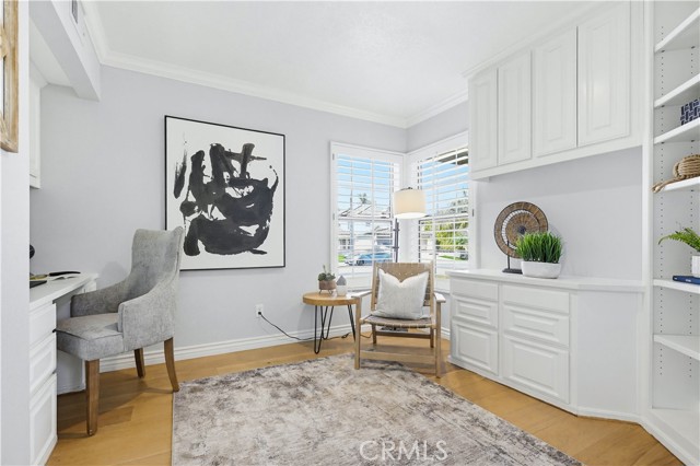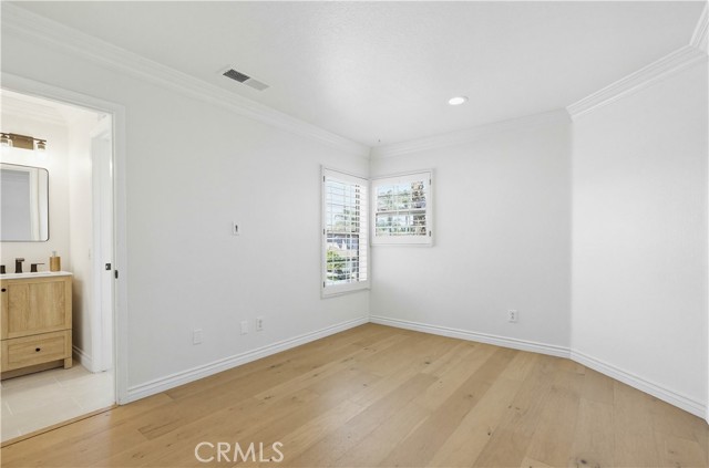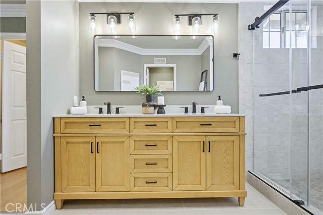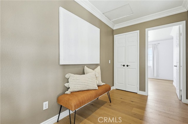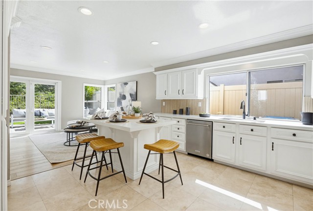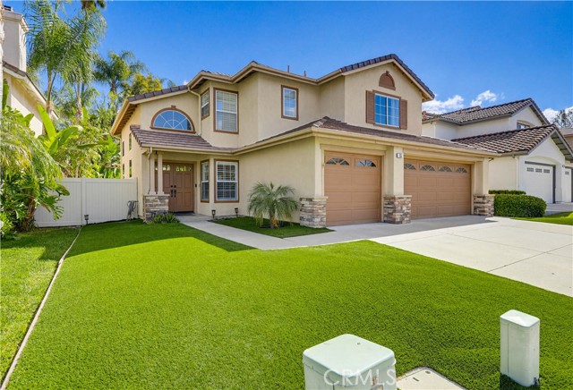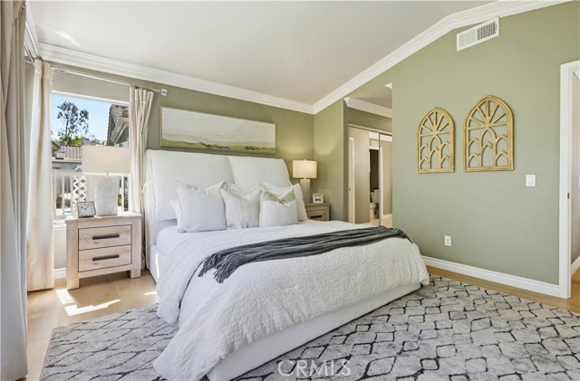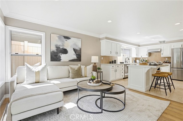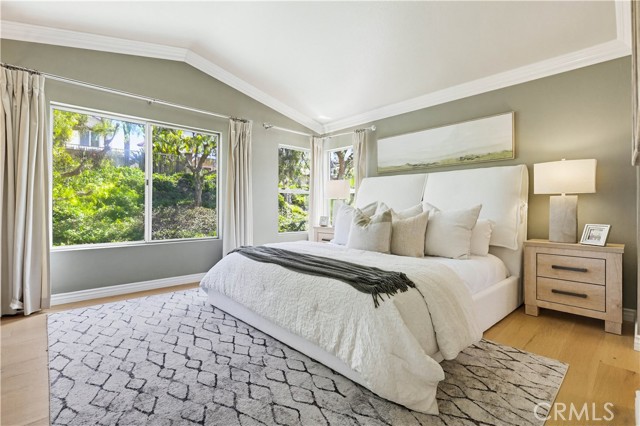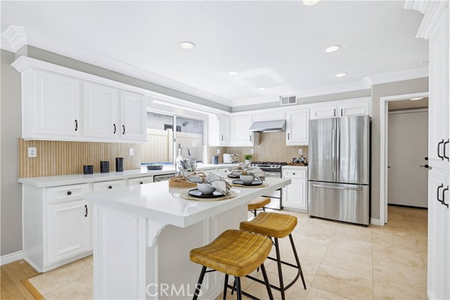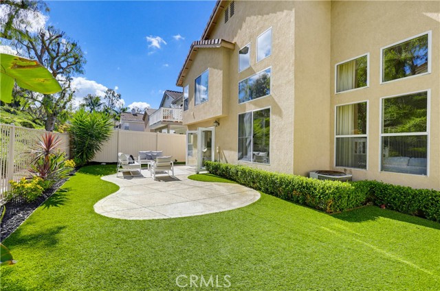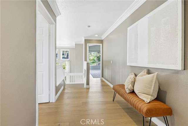 Prepare to fall in love with this spacious and beautifully updated California Crest home, a perfect example of pride in ownership! Ideally located on a family friendly cul-de-sac street in a highly desirable Pacific Hills neighborhood, this home pushes all the right buttons! Pass through the double door entry and soak in the soaring two story ceilings with an abundance of natural light streaming through the floor to ceiling windows. Extra wide crown molding, gorgeous wide plank wood floors, custom light fixtures, and a stunning centerpiece staircase set the stage for an impressive living environment. The formal living area is open to the formal dining room which features built-in cabinetry and wine rack, providing an elegant setting for dining and entertaining. Pass through to the sunny Kitchen which is open to the family room with built-in media center, cozy fireplace, and French doors opening to the backyard patio, a perfect indoor-outdoor living space. The beautifully updated and spacious kitchen features Quartz countertops and a stylish backsplash, timeless white cabinetry, Stainless-Steel appliances, and a prized center prep island with breakfast bar. The main level includes a stunning full bathroom with walk-in shower and a desirable bonus room perfect for a 4th bedroom or an executive home office with built-in bookcases and workstation. Travel up the light filled staircase to the large primary bedroom suite featuring vaulted ceilings, crown molding, two closets including a walk-in closet with built-in organizers, and a newly remodeled primary bath with custom Quartz topped dual vanity, new faucets and fixtures, a framed vanity mirror, updated lighting, and a large walk-in shower with custom tile surround and frameless glass enclosure. Two spacious upstairs guest bedrooms share a recently remodeled Jack & Jill bathroom. The sunny, low maintenance backyard is a peaceful oasis overlooking a lush greenbelt, perfect for relaxing with friends and family! The direct access 3 car garage features epoxy floors and an abundance of built-in storage cabinetry. Additional fine features and key details include a cost saving OWNED Solar System, repiped plumbing with PEX in 2025, the wood flooring installed and the Kitchen updated in 2022, and bathrooms remodeled in March of this year. Lake Mission Viejo membership, Low HOA dues, and No Mello Roos! Close to local schools, and just a short stroll to Pacific Hills Park.