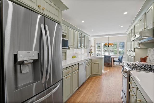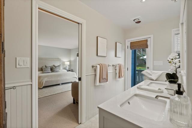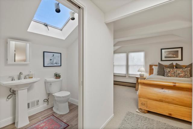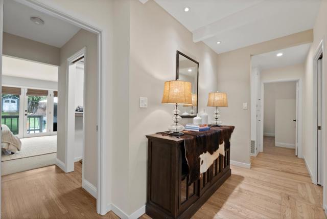 Welcome to this enchanting Belmont retreat where charm, serenity & thoughtful design come together beautifully. Tucked behind lush landscaping, this updated 3-beds, 3-baths + office residence offers 2 spacious en-suite bedrooms, 1 on the main level and 1 upstairs, providing excellent flexibility for guests or multi-generational living. Formal entry leads to the light-filled living/dining area featuring exposed beam ceilings, built-in display cabinetry, classic fireplace, and large windows. The inviting kitchen showcases soft sage cabinetry, quartz countertops, stainless-steel appliances, and a charming eat-in nook. The generous main-level primary suite with incredibly spacious closet and spa-inspired bath easily accommodates a sitting area and opens to the backyard through French doors. Also on the main level are a spacious secondary bedrm, home office & beautifully remodeled hallway bath with designer tiles, brass finishes, and dramatic skylight. Upstairs, a large family room with exposed beams and skylights accompanies the second en-suite bedroom with full bath. The backyard offers a large entertaining deck, expansive lawn, mature trees including a striking redwood, and a garden shed. It is conveniently located near parks, trails, shopping, dining, and easy access to 101 & 280.