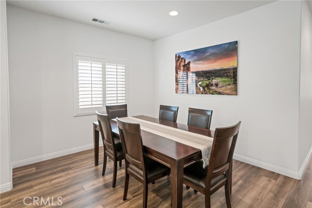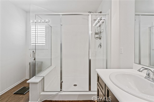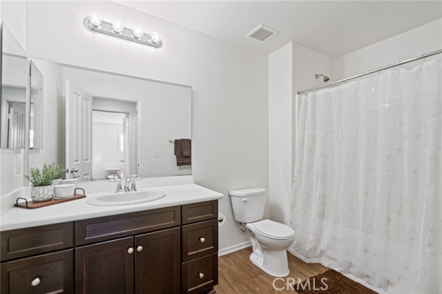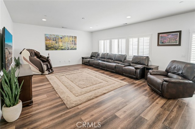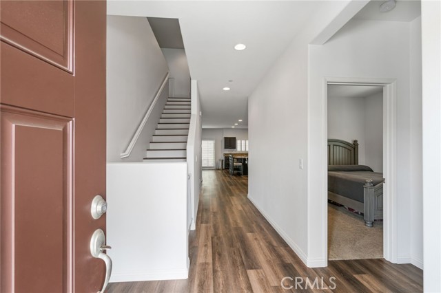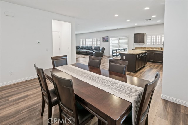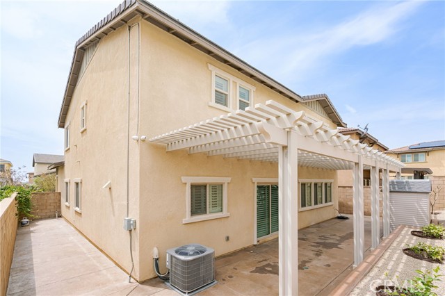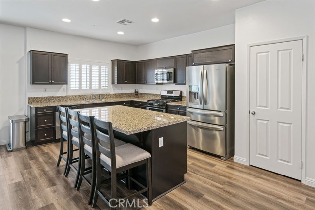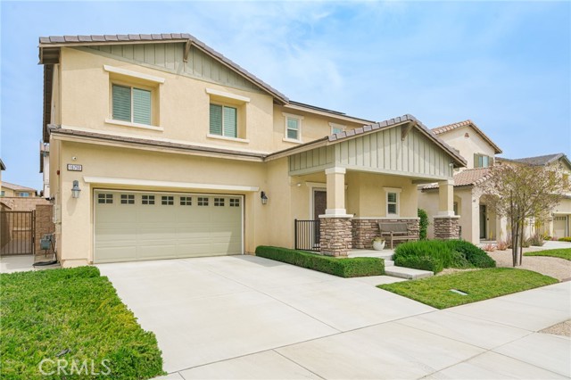 Beautiful 4 bedroom, 3 bathroom home in the Bella Strada community of Fontana. Built in 2017, this spacious two story home offers approximately 2,760 square feet with a highly functional open floor plan. The main level features a downstairs bedroom and full bathroom, ideal for guests, multigenerational living, or a home office. The kitchen opens to the dining area and large family room and includes granite countertops, a large center island with seating, dark wood cabinetry, stainless steel appliances, a gas range, built-in microwave, and walk-in pantry. Upstairs features a large loft, spacious secondary bedrooms, convenient laundry room, and an oversized primary suite with dual walk-in closets and an ensuite bath with dual sinks and a large glass-enclosed shower. Additional highlights include luxury vinyl flooring throughout, new baseboards throughout, plantation shutters, and recessed lighting. The backyard is designed for low maintenance with extensive concrete hardscape, a long covered pergola patio, side yard space, raised planter beds, block wall fencing, and a storage shed. Home includes paid-off solar, offering energy efficiency and added value. Bella Strada HOA amenities include a pool, park, and playground.