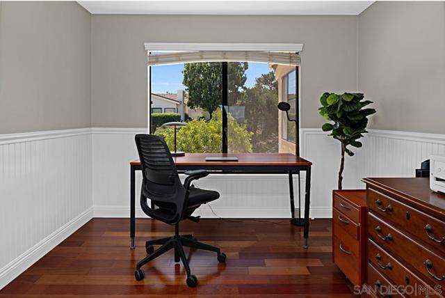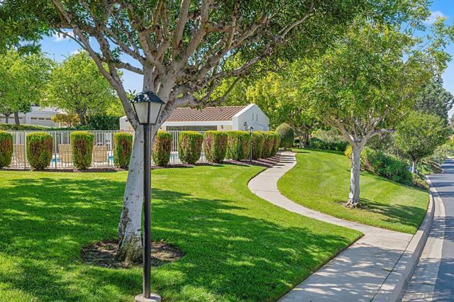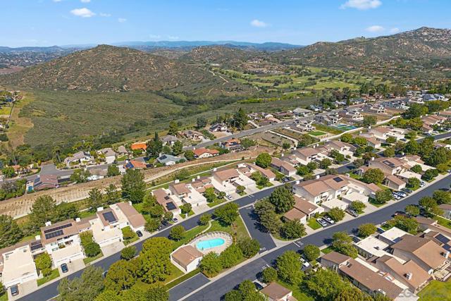 Peaceful mountain and greenbelt views highlight this light-filled upper-level single-story home in the highly desirable Stoneridge Chateaus community of North Poway, a quiet enclave set away from busy streets. The living room features vaulted ceilings and opens to a private balcony with beautiful mountain and greenbelt views, creating a tranquil setting rarely found in condo living. These views are also enjoyed from the primary bedroom. This spacious home offers 2 bedrooms, 2 bathrooms, and a versatile bonus room ideal for a home office, den, guest room, or potential third bedroom with the addition of a closet. Large windows enhance the open, airy feel. The inviting living room includes a cozy fireplace. Real cherry wood flooring runs throughout the main living areas and bedrooms. The kitchen features a bright breakfast area, generous cabinet space, and a laundry closet with a washer and dryer. The home has been refreshed and is move-in ready, with the opportunity to update over time to suit your style. The primary suite enjoys beautiful views and ample closet space, while the secondary bedroom provides privacy. Residents enjoy walking trails, open space, and two community pools and spas. Additional highlights include an oversized detached garage and ample guest parking. Conveniently located near Lake Poway, hiking trails, Bernardo Winery, shopping, dining, and within the award-winning Poway Unified School District.