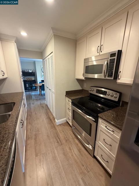 This beautiful Skywest townhouse is perfectly located on the Lafayette border for an easy commute. This two-story unit features two bedrooms, two and a half bathrooms, and an attached two-car garage. The entire home has been tastefully remodeled and updated. The lower level features laminate flooring and a remodeled kitchen. The small family room, which includes a fireplace, functions perfectly as a dining room and opens to a patio ideal for grilling. The living room also provides access to a second enclosed patio area. Upstairs, you will find two primary suites, both with beautifully remodeled en suite bathrooms. For your convenience, the home includes an inside laundry area with a washer and dryer, as well as a refrigerator. The complex offers excellent amenities, including tennis courts and a pool that is currently under renovation.