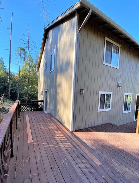 Just one mile from town, this lightly used vacation home offers beautiful mountain views with no HOA dues. The home features a dramatic two-story living room with a propane stove and French doors opening to a spacious wraparound deck—ideal for indoor-outdoor living. The floor plan includes three bedrooms and three full bathrooms, generous dining areas, and a well-appointed kitchen with abundant counter space and a breakfast bar. Adjacent to the kitchen is a separate laundry room with tile flooring and pantry cabinetry, along with an interior stairway providing convenient access to the garage. The oversized garage measures approximately 30' x 35' (over 1,000 square feet) and may accommodate up to four vehicles in tandem. Three garage walls are constructed of concrete block. The primary suite features French doors leading to a private deck, a walk-in closet, and ample natural light. Additional highlights include five ceiling fans, double-pane windows with mini and vertical blinds, new laminate and tile flooring in the great room, new gutters, newly paved driveway with retaining wall, recently pumped septic system, and insulation between each floor level for added comfort and sound control.