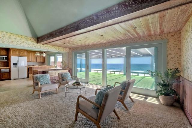ONCE-IN-A-LIFETIME Beachfront Opportunity-100 Feet of Oceanfront Living! Welcome to your dream estate--pristine beachfront, over 6,700 sq ft of living space & a 16,000+ sq ft lot designed for ultimate relaxation & entertainment. This rare oceanfront property features 7 bedrooms, 6 bathrooms & three full kitchens—one on each level—making it ideal for multi-generational living or large-scale entertaining. Step through the front door & be greeted by a dramatic staircase leading down to the expansive Primary Suite & oversized living room. Just off the main entry, you'll find a private office, guest bedroom & full bath, perfect for guests or a home workspace. The office features stunning ocean views & opens to a large private patio. On this main level, enjoy 3 more bedrooms-one is ensuite, 2 baths, a spacious dining room, sitting area & a full kitchen w/ eat-in bar. From here, step out onto an oversized patio or take the private beach access stairs down to the sand—or simply ride the elevator for convenience. Up a charming winding staircase from the kitchen is a cozy maid's quarters with its own Oceanview deck, providing a peaceful retreat. The 2nd level features the Primary Suite with a private balcony, two separate bathrooms, dual walk-in closets, and a dressing area that opens to an additional outdoor space. The adjacent living room is massive, perfect for family gatherings, and showcases the Pacific Ocean through walls of glass. A second kitchen and wet bar complete this level, with a nearby laundry room for convenience. Head to the beach level & you’ll find an entertainer’s paradise! This floor boasts a third kitchen, huge bar, shuffleboard table, full bathroom w/ two showers, a fun bunk room & direct access to the beach. Step outside to a sprawling patio, giant turf play area, sandbox w/ a custom wooden pirate ship & your very own private boardwalk with steps leading directly to the sand. Own your own slice of oceanfront paradise!