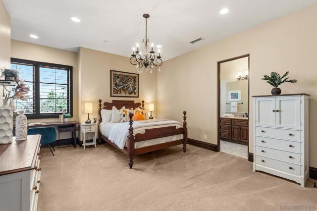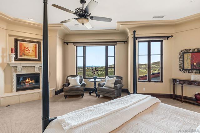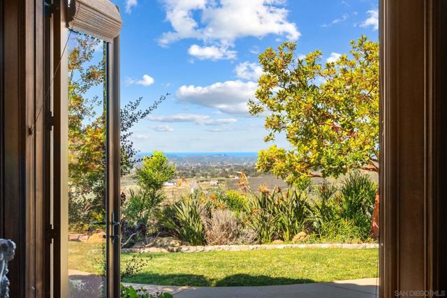 King of the Hill! This top quality, custom home enjoys a hilltop location on over 29 acres of land, with spectacular, panoramic ocean and open space views from every room and multiple outdoor entertaining areas. Overlooking the Bridges golf course, just half a mile from Encinitas and within the Rancho Santa Fe school district, this property offers coastal breezes and a rare combination of seclusion and easy access. The main residence provides 6 bedrooms and 7 baths with an open floorplan ideal for private enjoyment or entertaining in style. The grounds include private gardens, personal fruit orchards and miles of nature trails, with a second gate to a lower (but still ocean view) area with endless possibilities including equestrian, vineyards or the possible creation of additional parcels with their own separately gated access. This is a rare opportunity to enjoy the finest of North County living now, with the potential to ensure the same lifestyle for multiple generations. Designed by award-winning architect Dena Gillespie, this custom home features a chef’s kitchen with top-of-the-line appliances, a walk-in pantry, formal dining room, upgraded lighting, climate-controlled wine cellar, game room and spacious living areas with vaulted ceilings. The primary suite includes a luxurious bath, steam shower and a private balcony. Expansive views continue from the outdoor covered patios, infinity-edge pool and spa, fire pit, bocce ball court and surrounding private gardens providing abundant flowers and a wide array of delicious fruit. This energy-efficient home comes with a permitted private irrigation well, an owned solar panel system (with storage or chicken coops below) plus a Tesla Powerwall, delivering substantial savings on electricity and seamless backup power during outages.