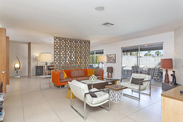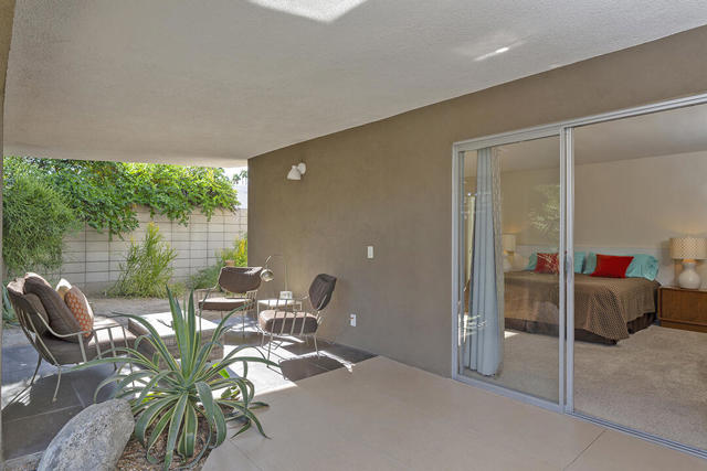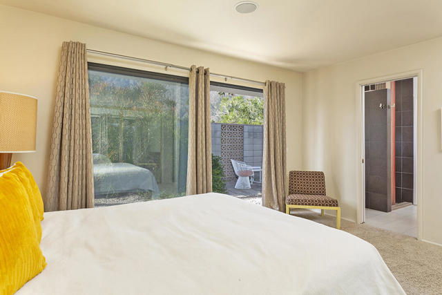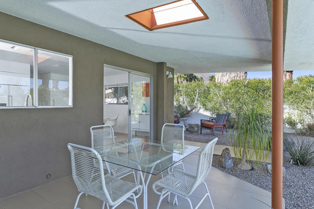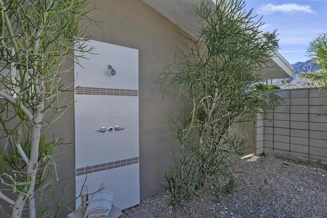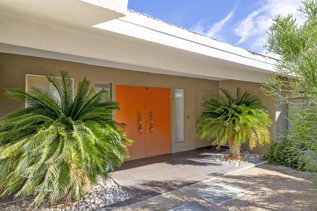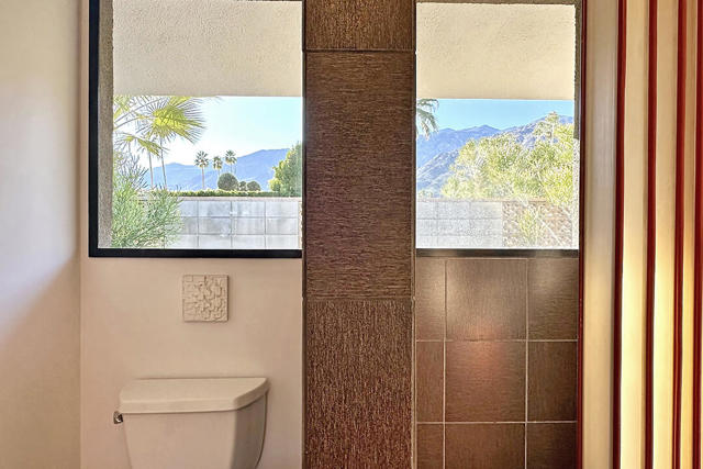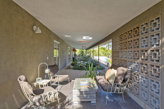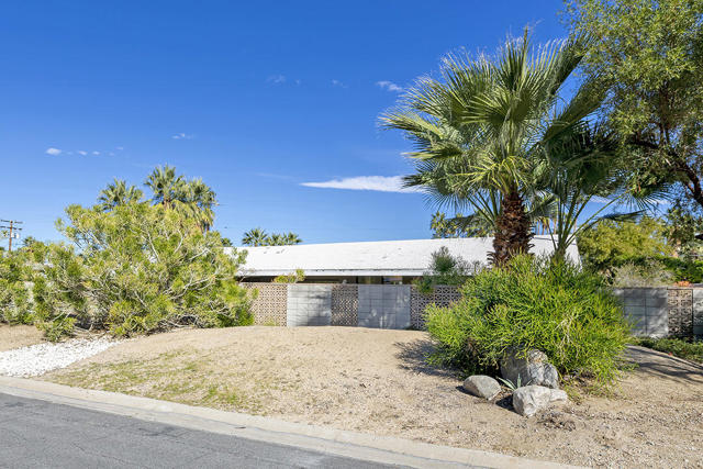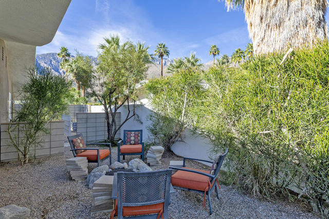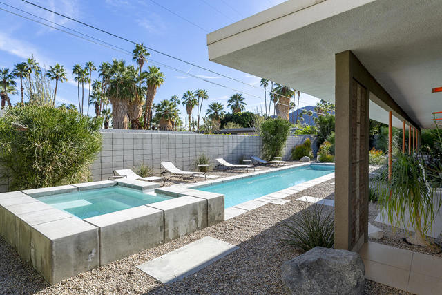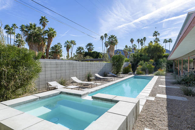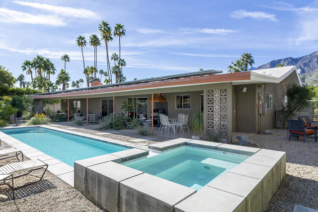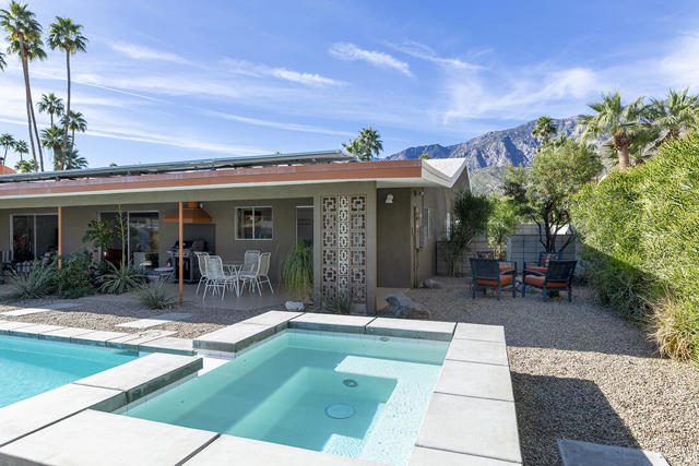 Escape to this entertainment hideaway located in the heart of Palm Springs' historic mid-century Twin Palms neighborhood. Extensively updated in 2013, this stylish El Camino Estates 3-bedroom, 3-bathroom home has been thoughtfully curated to preserve and expand upon its vintage heritage.Nestled within a natural high-desert landscape, sculpted berms and native desert plantings create privacy and intrigue for the single-story structure that has a courtyard accented with breeze block and a low-profile roofline with a gravel finish. Entering through the original double front doors, the open floor plan incorporates breeze-block partitions to define the living, dining, and kitchen areas. Features include the living room's corner gas fireplace and original mirrored display cabinet, and multiple sliding glass doors that open to a covered rear patio.The rear patio extends 75 feet along the back of the home, featuring multiple open skylights and repeating the breeze-block partitioning to create conversation areas and gathering points. The interplay of shade and sun is enchanting, with the freshly replastered lap-pool and spa just beyond. A side-yard fire pit with mountain views and an outdoor shower further enhance the resort-style setting.There is a chef's kitchen with a dining nook offering ample space for entertaining. It features a combination of white cabinetry, Caesarstone countertops, a prep island, and white appliances. The rear patio's barbecue station with a classic vent hood is right outside. The kitchen also includes a washer and dryer closet, pantry, and access to the two-car garage. The primary bedroom features a walk-in closet and an en-suite bath as well as sliding doors opening to a dedicated outdoor conversation area on the back patio. The en-suite bath's updates incorporate designer Formica accents on the restored 1960s cabinetry, paired with fresh solid-surface countertops and complimentary shower tile. Two additional bedrooms are located at the front of the home, both with mountain views and featuring sliding doors opening to the front courtyard, where each has a dedicated outdoor seating area for relaxation. Between these bedrooms is a shared Jack-and-Jill bath with windows that provide stunning mountain views while showering. Its vintage design includes earth-tone ceramic and glass tile, a restored 60s vanity, and a mid-century slatted shower curtain.This home also has a guest half bath and leased solar.