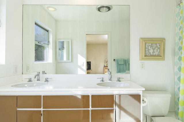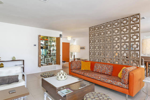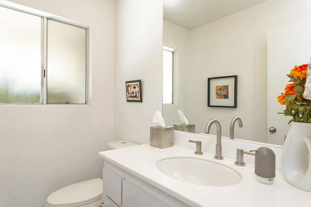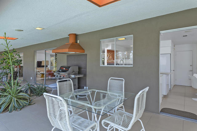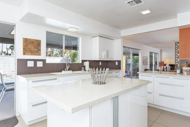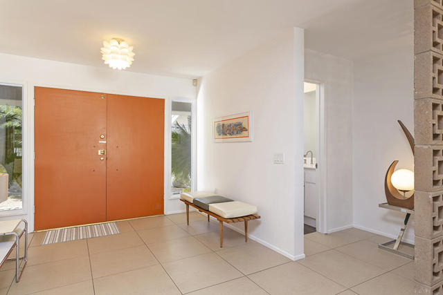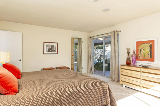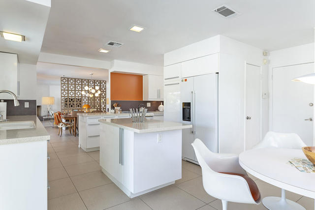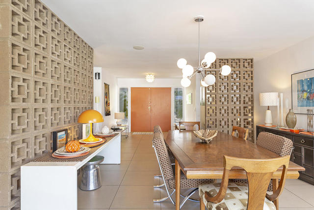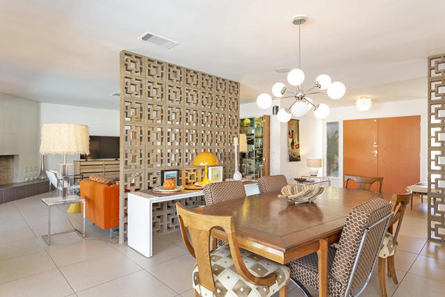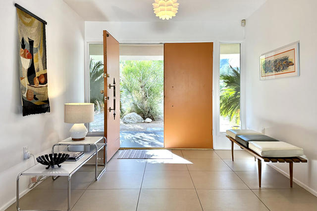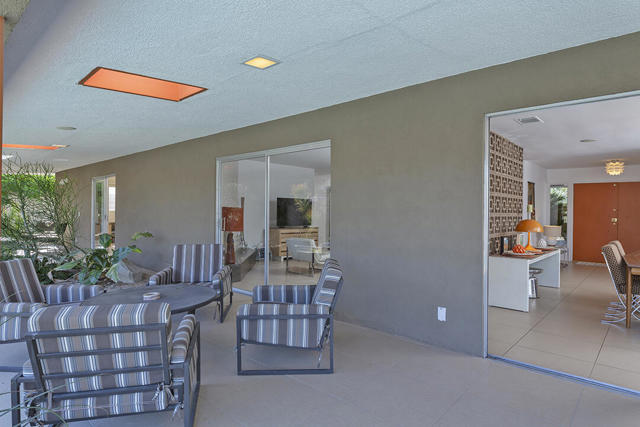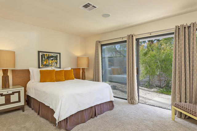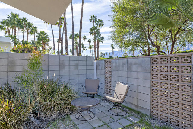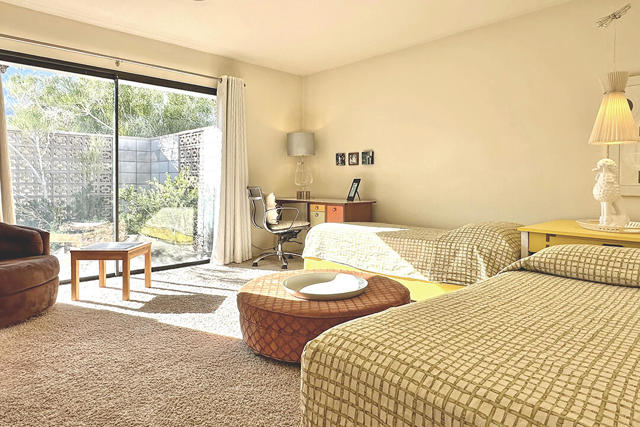 Escape to this entertainment hideaway located in the heart of Palm Springs' historic mid-century Twin Palms neighborhood. Extensively updated in 2013, this stylish El Camino Estates 3-bedroom, 3-bathroom home has been thoughtfully curated to preserve and expand upon its vintage heritage.Nestled within a natural high-desert landscape, sculpted berms and native desert plantings create privacy and intrigue for the single-story structure that has a courtyard accented with breeze block and a low-profile roofline with a gravel finish. Entering through the original double front doors, the open floor plan incorporates breeze-block partitions to define the living, dining, and kitchen areas. Features include the living room's corner gas fireplace and original mirrored display cabinet, and multiple sliding glass doors that open to a covered rear patio.The rear patio extends 75 feet along the back of the home, featuring multiple open skylights and repeating the breeze-block partitioning to create conversation areas and gathering points. The interplay of shade and sun is enchanting, with the freshly replastered lap-pool and spa just beyond. A side-yard fire pit with mountain views and an outdoor shower further enhance the resort-style setting.There is a chef's kitchen with a dining nook offering ample space for entertaining. It features a combination of white cabinetry, Caesarstone countertops, a prep island, and white appliances. The rear patio's barbecue station with a classic vent hood is right outside. The kitchen also includes a washer and dryer closet, pantry, and access to the two-car garage. The primary bedroom features a walk-in closet and an en-suite bath as well as sliding doors opening to a dedicated outdoor conversation area on the back patio. The en-suite bath's updates incorporate designer Formica accents on the restored 1960s cabinetry, paired with fresh solid-surface countertops and complimentary shower tile. Two additional bedrooms are located at the front of the home, both with mountain views and featuring sliding doors opening to the front courtyard, where each has a dedicated outdoor seating area for relaxation. Between these bedrooms is a shared Jack-and-Jill bath with windows that provide stunning mountain views while showering. Its vintage design includes earth-tone ceramic and glass tile, a restored 60s vanity, and a mid-century slatted shower curtain.This home also has a guest half bath and leased solar.