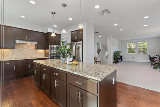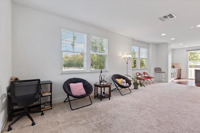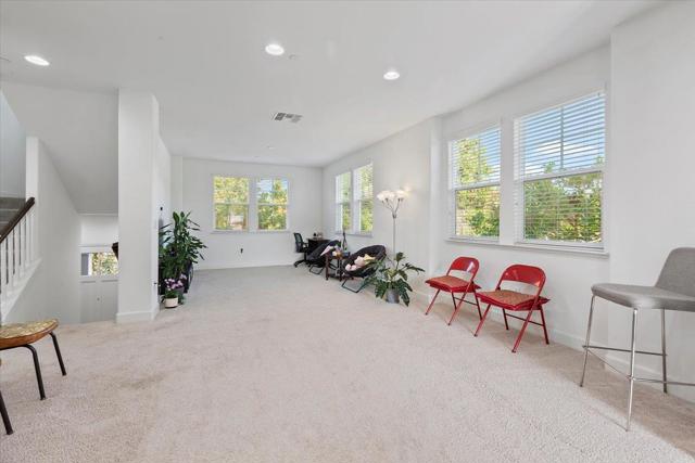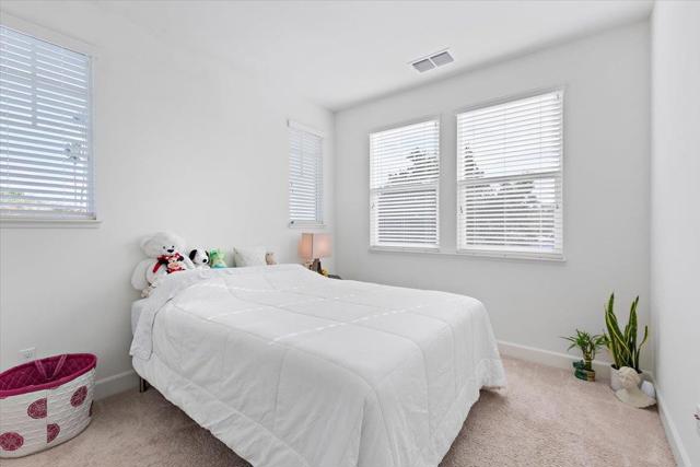 Beautiful end-unit townhome is designed with comfort and elegance. The expansive Great Room features a spacious kitchen, dining area and a generous living space. The modern kitchen is equipped with a large island, pantry with classic door, and opens to a balcony. Premium finishes include stone countertops, tile backsplash, and ample cabinetry for all your storage needs. Upstairs, the primary suite offers a luxurious sanctuary with a spacious shower, dual-sink vanity, private water closet, and an expansive walk-in closet complete with organizers to maximize space and functionality. Hall bathroom has shower/tub and dual sink vanity. The ground-level suite provides flexibility and convenience with glass French door opening to spacious patio and bathroom with accessible shower and toilet. Premium features include tile floors in all bathrooms, upper-level laundry, and solar system. Conveniently located near Silicon Valley employment campuses (e.g., 6 to 12 minute bike ride to the Googleplex), Heritage Park, Wyandotte Park, Sierra Vista Park, Costco, Safeway, restaurants and 101. Monta Loma Elementary, Crittenden Middle, Los Altos High.