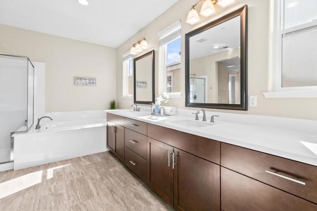 This gorgeous 3,090 sqft single-family home, built in 2019, is located on a desirable corner lot in the prestigious Asana community. It features 3 spacious bedrooms, 2 full baths, and 2 half baths. A versatile room on the first or second floor can be used as a living room, home office, guest room, or for many other purposes. The contemporary open floor plan showcases a chef's kitchen with high-end Italian appliances, quartz countertops, custom cabinetry, and an oversized island. Soaring ceilings, laminate flooring, and large windows fill the home with abundant natural light and scenic views.The luxurious primary suite serves as a private retreat with a massive walk-in closet and a spa-inspired ensuite featuring a soaking tub and walk-in shower. Enjoy outdoor living with a private balcony, covered patio, and paved side yard. Additional highlights include a fully owned solar system, EV charging capability, and ample storage throughout. The community enhances this luxurious lifestyle with resort-style amenities, including a clubhouse, playground, community garden, BBQ area, and walking paths. Conveniently located near major highways and within walking distance of Costco, Eastridge Mall, Starbucks, sports fields, and much more. Move-in ready! A must-see!