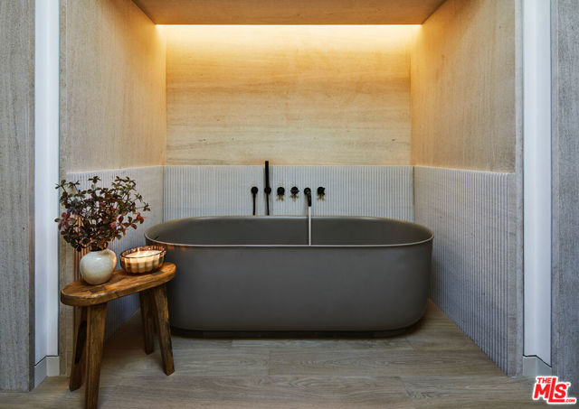 This architecturally significant Buff & Hensman mid-century modern residence, located in the exclusive Malibu Colony, reflects the architects' signature wood-and-glass language that shaped Southern California coastal design. The home preserves its original design intent while introducing a clean, contemporary sensibility.A private gated entry opens to a gravel drive court and a limestone approach framed by mature sycamores, with a tranquil front water feature. This rare, enclosed front courtyard offers a level of space and privacy seldom found in the Colony.Inside, the residence unfolds through an open-concept plan with five bedrooms and five bathrooms, soaring ceilings, and a sculptural floating staircase defined by solid white oak treads set against a dramatic wall of glass. The kitchen is designed as a minimalist centerpiece with Gaggenau appliances, streamlined cabinetry, and a generous island for everyday living and entertaining. Integrated Control4 automation and whole-home audio support seamless indoor-outdoor functionality.The primary suite offers a quiet retreat with mountain and ocean views, a spa-inspired bath finished in honed limestone and white oak, a carved rigato stone bathing niche, private water closet, and dual custom closets.A French grey plaster pool anchors the outdoor experience alongside an outdoor sauna, complemented by a fully equipped outdoor kitchen and multiple gathering areas designed for year-round coastal living.Privately gated with approximately 50 feet of street frontage and deeded beach access reserved for a limited group of homeowners, the property pairs privacy, security, and proximity to the shoreline within one of Malibu's most coveted enclaves.