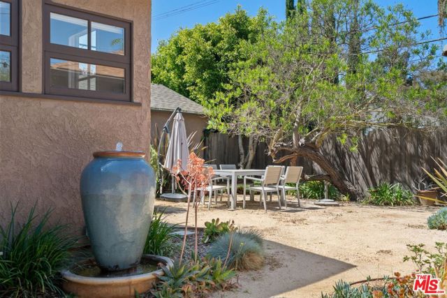 Located within the desirable Beverlywood HOA neighborhood, and in the much sought after Castle Heights Elementary School District this charming, Spanish influenced single family residence really feels like home! Enter into the light filled living room and be greeted by gleaming wood floors, vaulted ceilings with exposed beams and a decorative fireplace. The open plan concept seamlessly connects a dining area and a kitchen with island seating, to doors that open to the zen-like yard with lush succulent landscaping, a tranquil fountain, and mature fruit and olive treescreating an inviting setting for California's indoor-outdoor living and entertaining. Just off the kitchen you will also find a pantry and laundry area with washer and dryer, and next to that a smaller bedroom ideal for home office or nursery. The primary suite, which also has direct access to the outdoor space, is a private retreat with vaulted ceilings, dual closets, and a spa-inspired en suite bath with double vanities and a soaking tub with rain shower. The third bedroom at the front of the house is a good size and conveniently located next to the fun and bright Spanish tiled 2nd bathroom. The convenience of a storage shed tucked away behind the finished garage allows for the concept of using the garage as an extension of the home - whether an extra hang out space, home gym or art studio. With central heat and Air Conditioning, this home delivers year-round comfort in one of the Westside's most welcoming and sought-after neighborhoods.