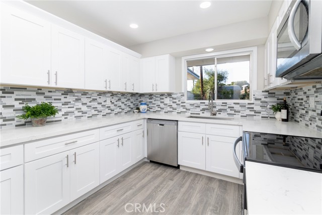 Charming and remodeled! Experience the best of senior living in this bright 55+ single-story home. Features include stylish new flooring and neutral paint throughout. The upgraded kitchen is a chef's delight with quartz counters, backsplash and stainless appliances, flowing into a cozy living area and a flexible den. The bathroom features a modern vanity and a beautiful tiled shower-tub combo. Enjoy the convenience of a separate laundry room and a massive attached storage area. Roof is new!