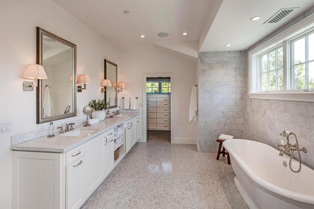 Hamptons-style elegance defines this refined estate custom built just 9 years ago in a premier location one-half mile from the Village. Distinguished interiors showcase hardwood floors, crisp white millwork, and elegant finishes of stone, tile, and brick. Built by MJK Homes, Architecture by Duxbury Architects, Interiors by Kriste Michelini Interiors. The home features sophisticated formal rooms, a library with office, and a stunning kitchen and open family room. There are 5 bedrooms, 5 full baths, and 2 half-baths, including a main-level suite ideal for guests and a luxurious upstairs primary suite. French doors open to a Connecticut bluestone terrace with outdoor kitchen, dining and fireplace patios, and a resort-like yard with vast lawn, pool, and spa. A pool house with kitchenette and full bath offers flexible use or potential as an ADU. With modern comforts and integrated technology, this East Coast inspired retreat offers the ultimate in quiet sophistication on approximately 1 acre and with access to excellent Los Altos schools.