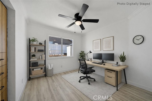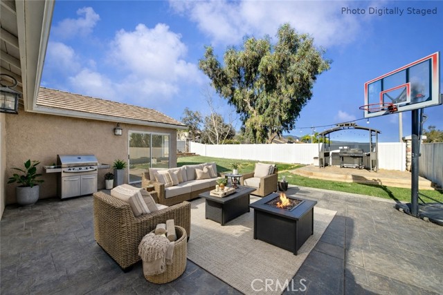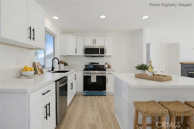 Fully remodeled and move-in ready! This beautifully updated home features new plank flooring throughout and a stunning feature fireplace that anchors the living room. The brand-new kitchen offers white shaker cabinets, white quartz countertops, and sleek black fixtures for a modern, clean look. Bathrooms have been tastefully updated with matching white quartz and black fixtures, and recessed lighting adds a bright, contemporary feel throughout the home. The spacious primary suite offers a private retreat with a sliding glass door leading directly to the patio. Additional upgrades include a whole-house water softener system, tankless water heater, and built-in garage cabinets for extra storage and organization. Enjoy outdoor living with a stamped concrete patio, fresh sod in both the front and rear yards, and two storage sheds in the backyard for added convenience. Ideally located just minutes from the community center, elementary school, parks, shopping, and freeway access.