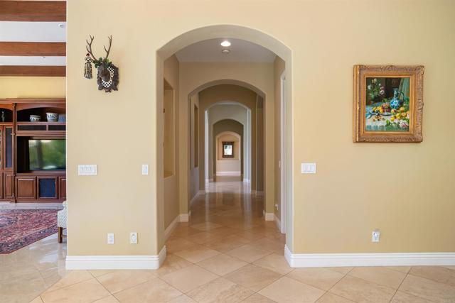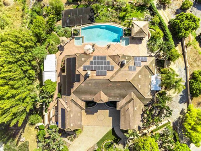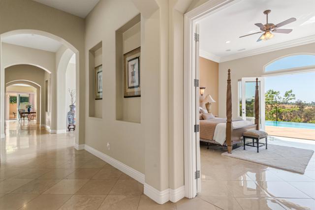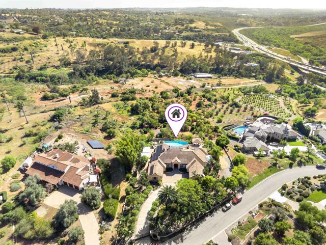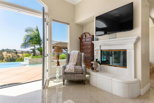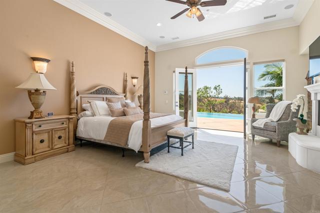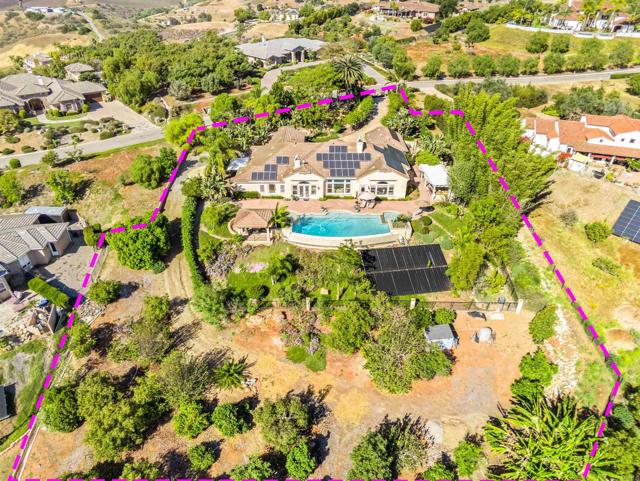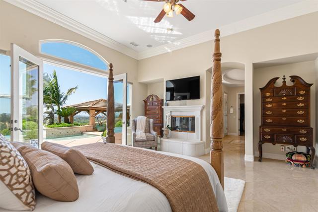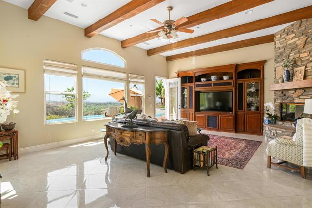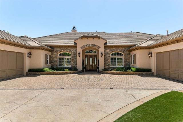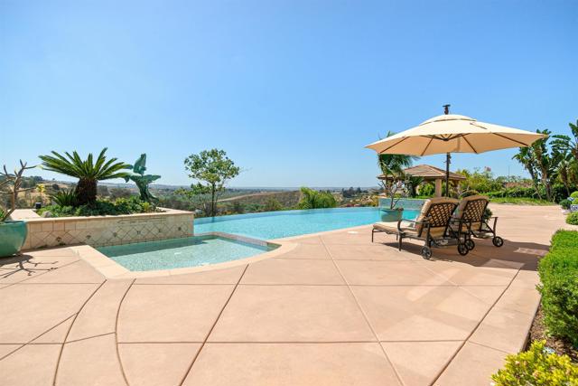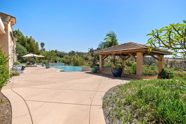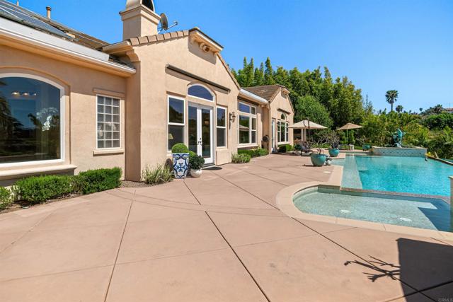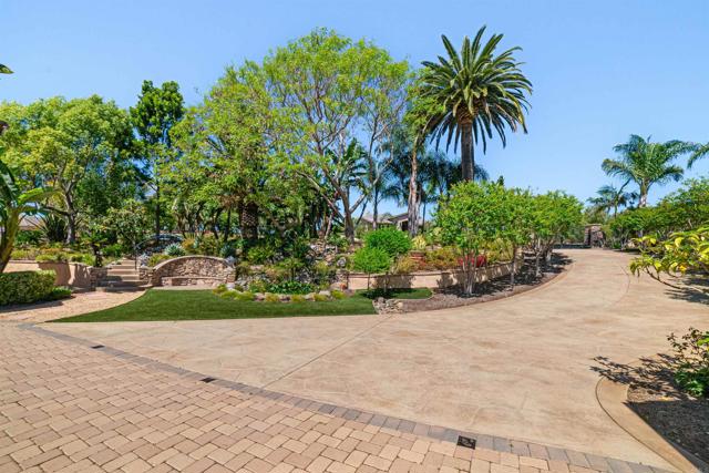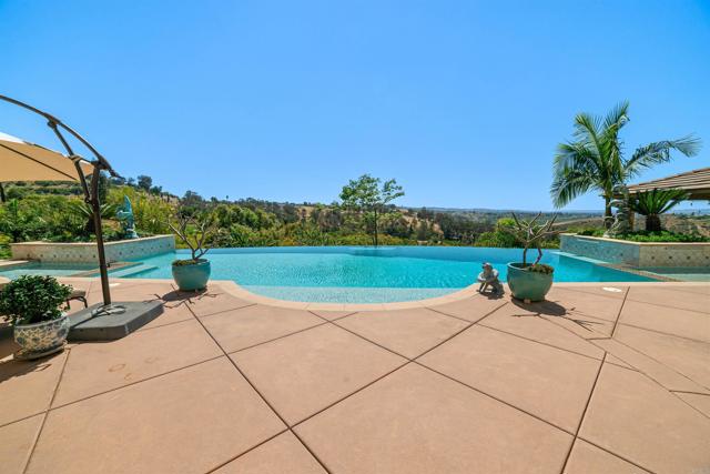 Luxury, privacy, and breathtaking views define this single-story 4,400 sq. ft. estate in the prestigious gated community of Château Belle Vue. Set on 2.2 serene acres, this Mediterranean-inspired residence welcomes you with a private curved driveway, custom paver courtyard, and lush, meticulously landscaped grounds. Inside, soaring ceilings, wood-beam accents, and an open, sun-filled layout create an atmosphere of elegance and ease. The gourmet kitchen features high-end stainless steel appliances, a 6-burner range with pot-filler, granite countertops, an oversized island, and a walk-in pantry. The adjoining living spaces offer seamless indoor-outdoor flow, perfect for both everyday comfort and grand entertaining. Custom window coverings, including plantation shutters and designer roller shades, enhance both style and privacy throughout the home. The luxurious primary suite provides a peaceful retreat with its own fireplace, a spa-style bath, soaking tub, dual vanities, and a spacious walk-in closet. All additional bedrooms include private en-suite baths. Step outside to your own private resort: an infinity-edge pool, expansive patios, and a pergola-covered outdoor kitchen/BBQ. Two additional covered pergola sitting areas offer the perfect spots to unwind, enjoy the breeze, and take in the stunning sunset views. The grounds also feature an avocado grove, citrus trees, solar, and a 4-car garage. Additional highlights include a waterfall with a lily pond, a private entry gate, and a separate grove service gate, enhancing both convenience and seclusion. All of this is located within just 10 miles of some of San Diego’s most beautiful beaches, offering the perfect blend of country tranquility and coastal lifestyle. A rare opportunity to own a true Bonsall luxury estate, tranquil, private, and crafted for exceptional living. Additional professional photos coming soon!