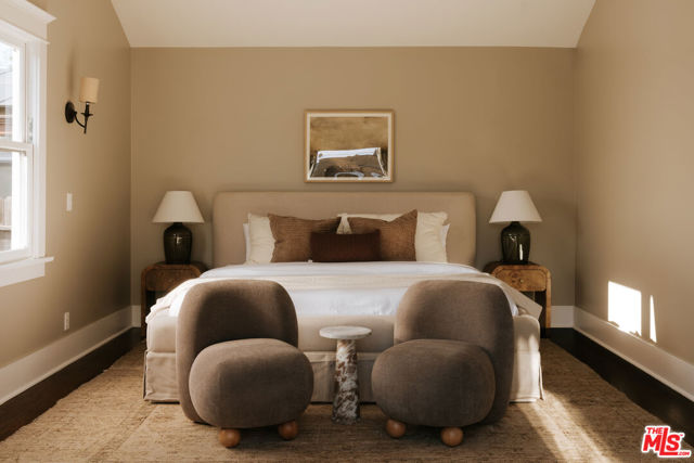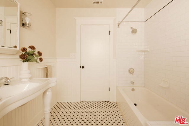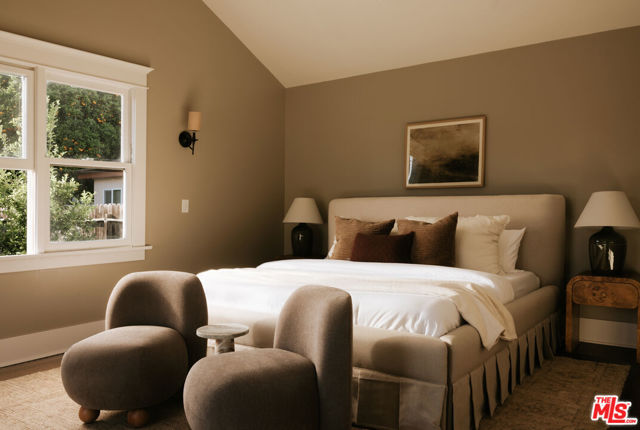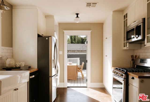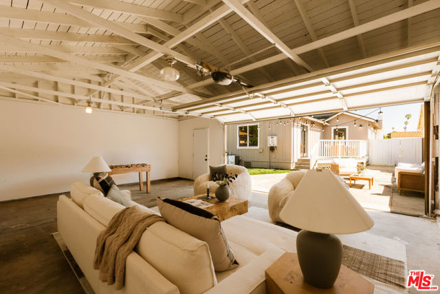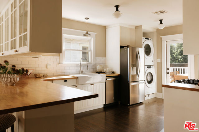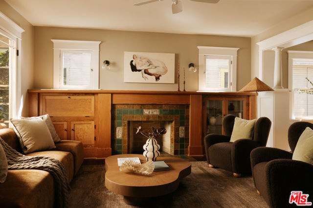 A thoughtfully restored Craftsman by Art Craft Homes in a great pocket of West Adams. A home that exemplifies the perfect balance of bright & fresh contemporary feel with historic preservation. The verdant front yard and wide porch are set behind an idyllic white picket fence. Inside, the open layout runs from the living room, which features a Batchelder-esque tile fireplace and built-ins, through to the dining area with decorative crown moldings, and into the kitchen. The kitchen includes glass-front cabinetry, wood countertops, a farmhouse sink, and a paneled dishwasher. The front bedroom, originally called a parlor room, makes for a great home office. The primary, with its vaulted ceiling, has a generous scale. Doors from both the kitchen and primary bedroom open to a spacious backyard with a deck, grassy area, and a double-bay garage with fantastic ADU potential. Be a part of the burgeoning West Adams neighborhood, and close to great new spots like Maydan Market, Halfday Coffee, and The Little Room.