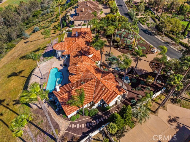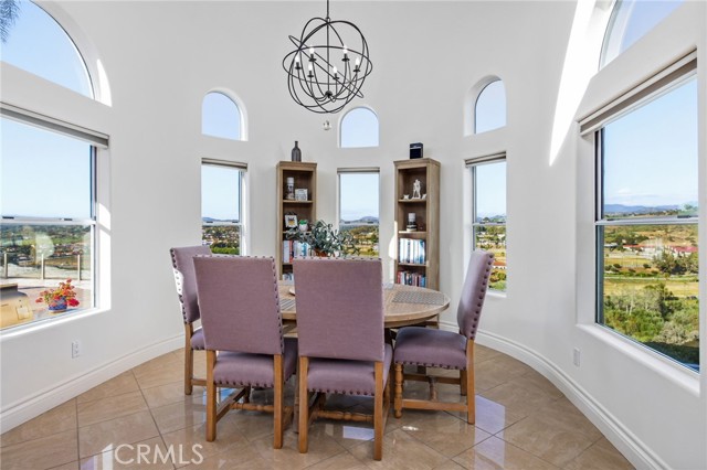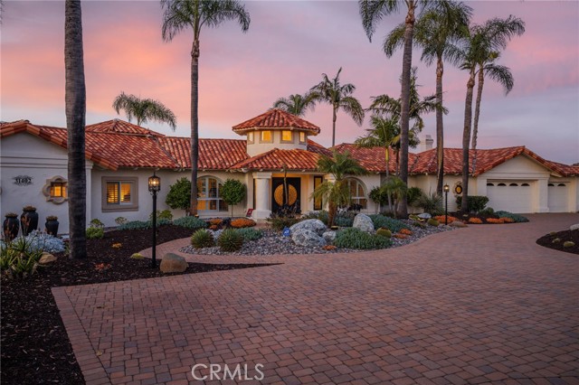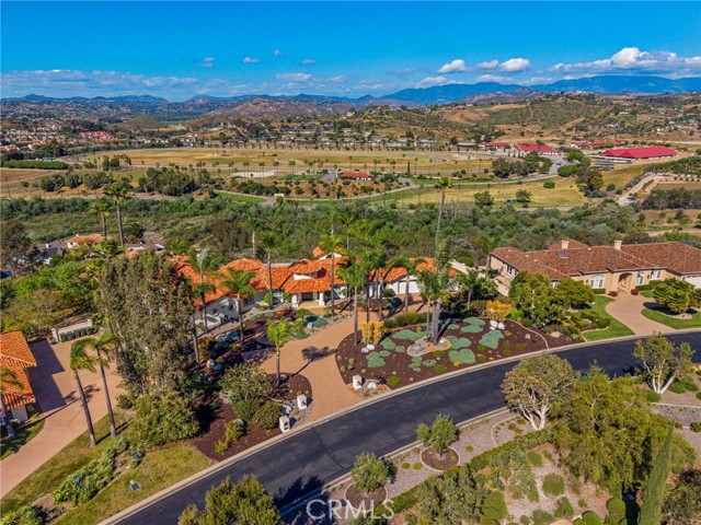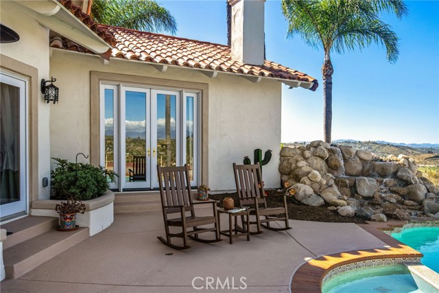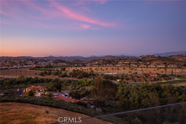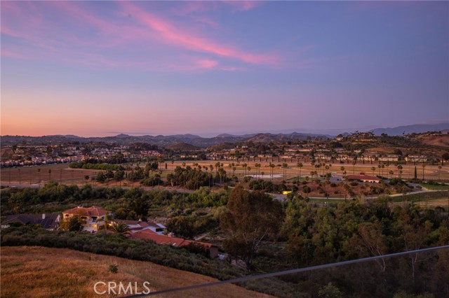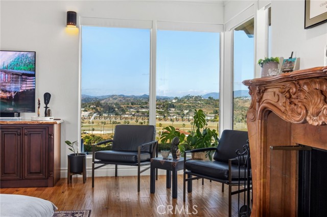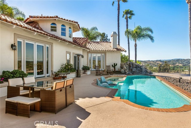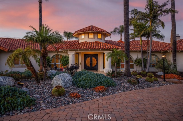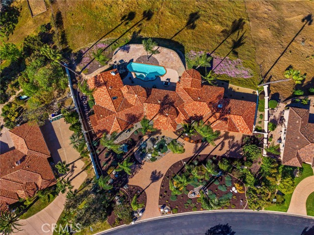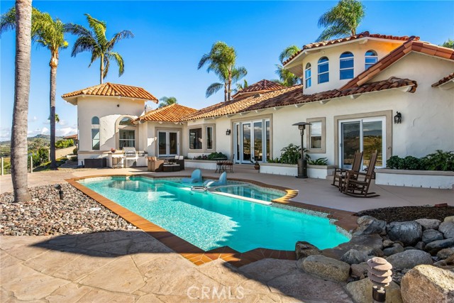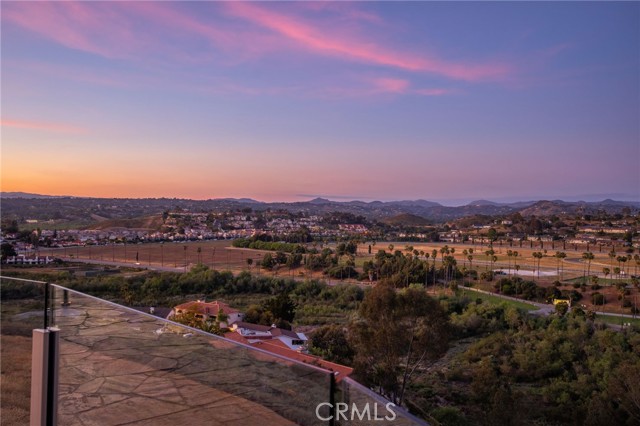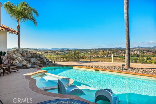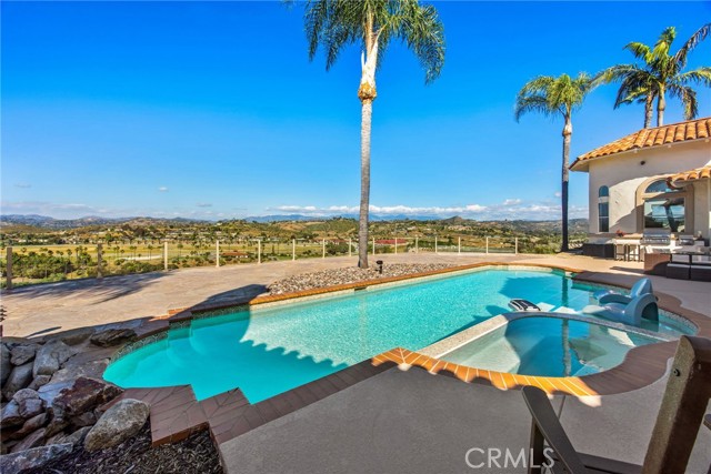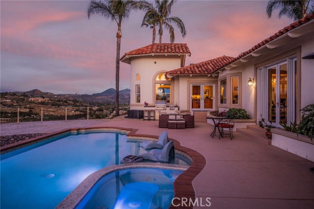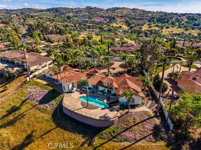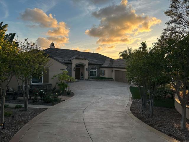 Perched at the farthest point along the hillside above the renowned San Luis Rey Downs Racetrack in the gated community of Lake Vista Estates, this exceptional residence captures sweeping panoramic views of the San Luis Rey Valley toward distant mountains. The setting evokes the beauty of a Tuscan countryside—where mornings begin with sunrise coffee on the terrace and you can watch the horses train and trot along the track below. Thoughtfully designed to maximize both views and livability, the home offers a flexible floor plan that lives comfortably as a 4-bedroom home—each with its own ensuite bath—plus a dedicated office privately positioned in a charming turret with elevated valley views. A grand Mediterranean-style entry introduces the home’s architectural concept of sequential framing, guiding the eye through elegant openings from the formal dining room to the living spaces and onward to surrounding vistas. The bespoke primary suite serves as a luxurious retreat featuring an imported Italian marble fireplace, French doors opening directly to the pool terrace, dual walk-in closets, and a spa-inspired bath with split vanity sinks, heated floors, a multi-jet soaking tub, and steam shower. An oversized laundry room with abundant cabinetry provides excellent storage. Refined craftsmanship is showcased throughout with marble and hardwood flooring, exposed beams, Venetian plaster walls, and distinctive turret architecture with soaring dome-vaulted ceilings. The chef’s kitchen features a generous breakfast nook, oversized marble-topped island with a new Miele induction range, Sub-Zero refrigerator drawers, walk-in pantry, and custom cabinetry designed for both display and convenience. The adjacent family room offers generous scale with a fireplace, built-in hutch, and media wall. Outdoors, the meticulously landscaped grounds create a resort-like setting with privacy from neighbors on a forward extended patio. The landscape boasts drought-conscious succulent gardens, a rose garden, sleek glass fencing, and a newly resurfaced pool accented by a natural stone waterfall. A built-in BBQ with bar seating invites effortless entertaining, while expansive patios provide the perfect setting to enjoy the home’s extraordinary views and tranquil surroundings. A spacious three-car garage includes additional storage cabinets and an EV charging station. This is elevated living—where luxury, comfort, and peaceful scenery converge into a dream fulfilled.