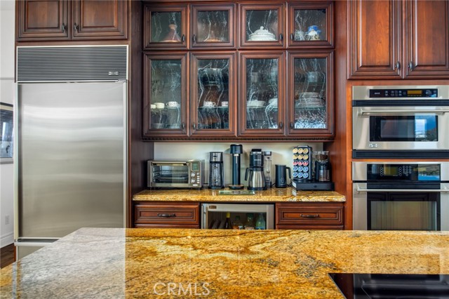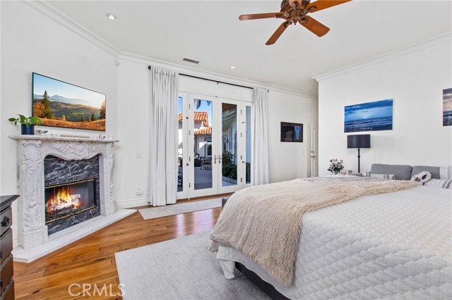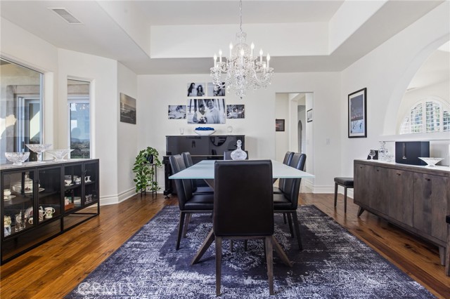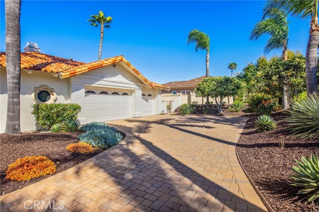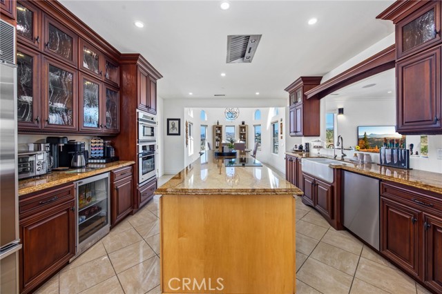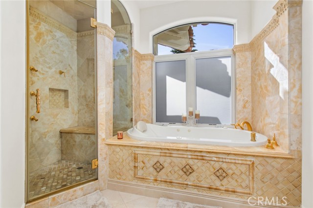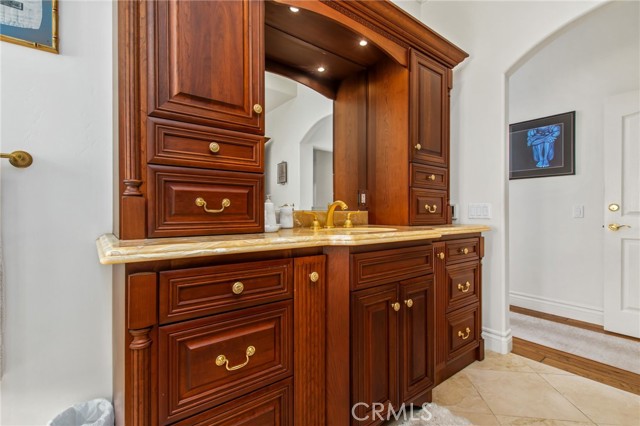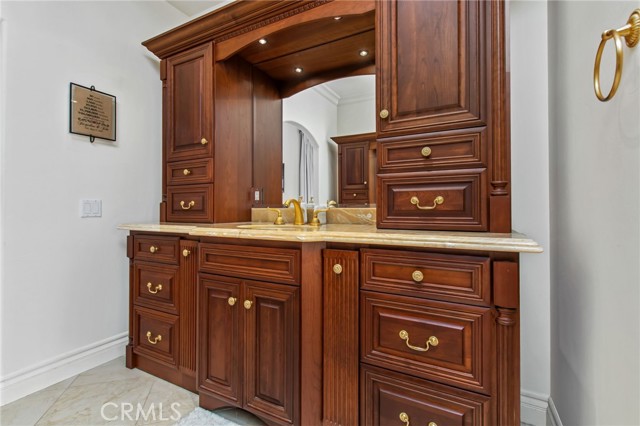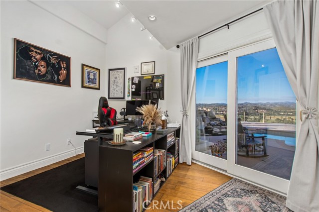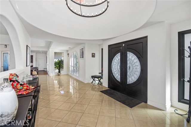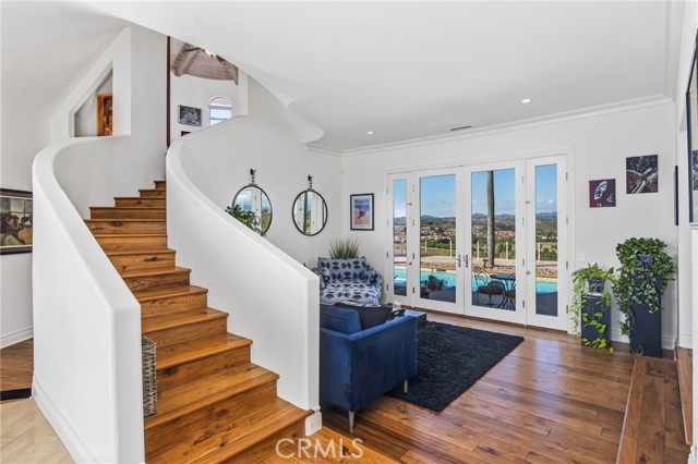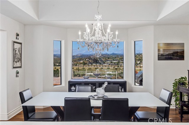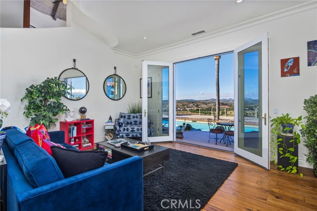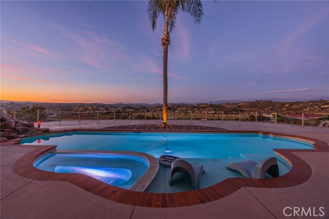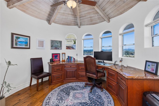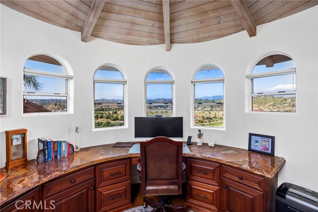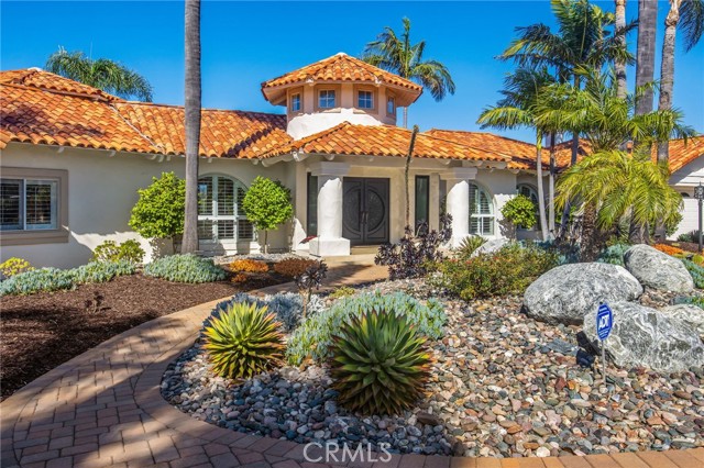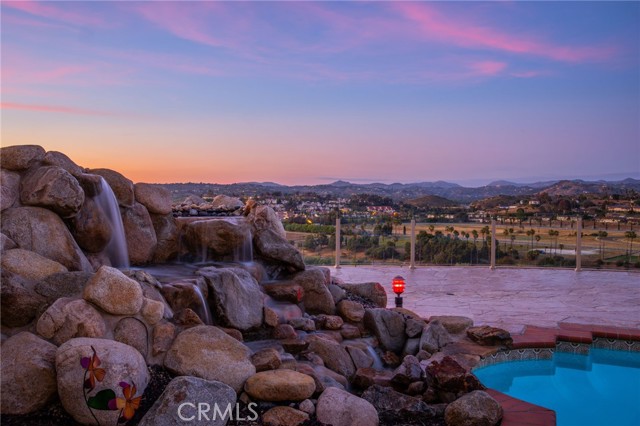 Perched at the farthest point along the hillside above the renowned San Luis Rey Downs Racetrack in the gated community of Lake Vista Estates, this exceptional residence captures sweeping panoramic views of the San Luis Rey Valley toward distant mountains. The setting evokes the beauty of a Tuscan countryside—where mornings begin with sunrise coffee on the terrace and you can watch the horses train and trot along the track below. Thoughtfully designed to maximize both views and livability, the home offers a flexible floor plan that lives comfortably as a 4-bedroom home—each with its own ensuite bath—plus a dedicated office privately positioned in a charming turret with elevated valley views. A grand Mediterranean-style entry introduces the home’s architectural concept of sequential framing, guiding the eye through elegant openings from the formal dining room to the living spaces and onward to surrounding vistas. The bespoke primary suite serves as a luxurious retreat featuring an imported Italian marble fireplace, French doors opening directly to the pool terrace, dual walk-in closets, and a spa-inspired bath with split vanity sinks, heated floors, a multi-jet soaking tub, and steam shower. An oversized laundry room with abundant cabinetry provides excellent storage. Refined craftsmanship is showcased throughout with marble and hardwood flooring, exposed beams, Venetian plaster walls, and distinctive turret architecture with soaring dome-vaulted ceilings. The chef’s kitchen features a generous breakfast nook, oversized marble-topped island with a new Miele induction range, Sub-Zero refrigerator drawers, walk-in pantry, and custom cabinetry designed for both display and convenience. The adjacent family room offers generous scale with a fireplace, built-in hutch, and media wall. Outdoors, the meticulously landscaped grounds create a resort-like setting with privacy from neighbors on a forward extended patio. The landscape boasts drought-conscious succulent gardens, a rose garden, sleek glass fencing, and a newly resurfaced pool accented by a natural stone waterfall. A built-in BBQ with bar seating invites effortless entertaining, while expansive patios provide the perfect setting to enjoy the home’s extraordinary views and tranquil surroundings. A spacious three-car garage includes additional storage cabinets and an EV charging station. This is elevated living—where luxury, comfort, and peaceful scenery converge into a dream fulfilled.