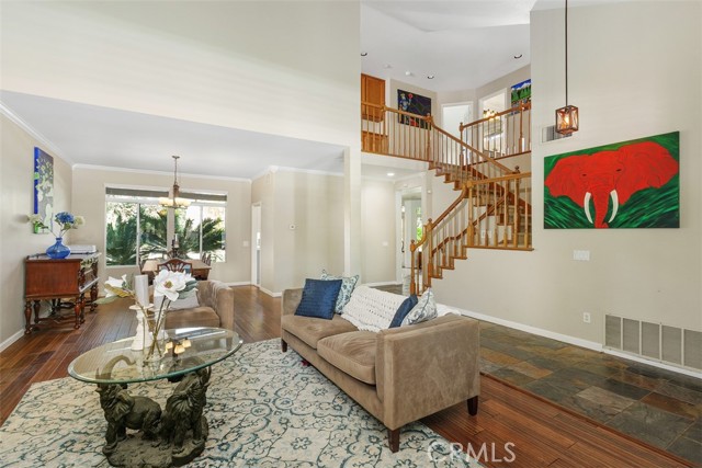 Welcome to this stunning home in the highly desirable Red Hawk community, where comfort, elegance, and lifestyle come together beautifully. A manicured front walkway leads you into a grand living room featuring soaring cathedral ceilings, plantation shutters, crown molding, and a striking fireplace. Slate and engineered wood flooring, along with plush carpeting, and updated fixtures, enhance the home’s polished feel throughout. The formal dining room flows seamlessly into a bright, well-appointed kitchen and inviting family room, complete with a charming brick fireplace. A powder room and a downstairs laundry room with convenient side-yard access add to the home’s thoughtful layout. Step outside to a beautifully landscaped, pool-sized backyard with mature trees, lush shrubs, and a paver patio—perfect for entertaining or relaxing in your own private retreat. Upstairs, you’ll find four spacious bedrooms, including a primary suite with double-door entry and a private ensuite bath. Both upstairs bathrooms feature dual sinks along with elegant slate and tile flooring. The three-car garage for the toys and storage With low taxes and HOA, close proximity to highly rated schools, shopping, golf courses, and Pechanga Resort & Casino, this is an exceptional opportunity to own in one of Temecula’s most coveted communities.