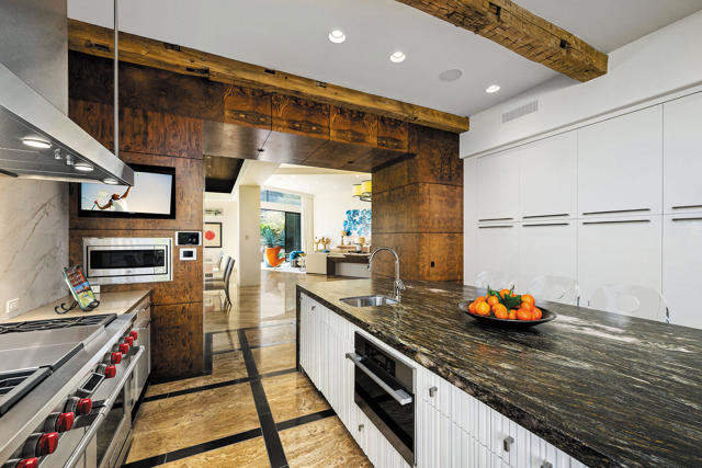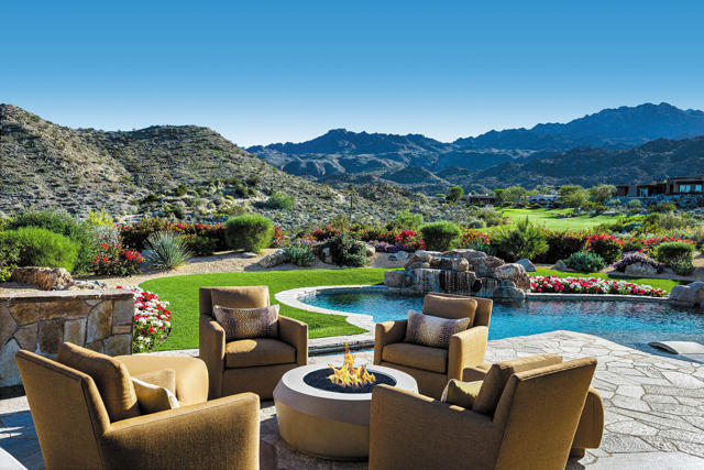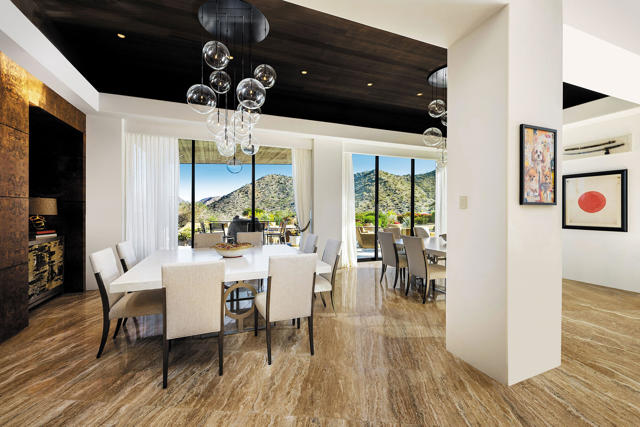 Welcome to a home where life slows down, views outstretch, and every day is magical. Perfectly positioned and elevated about the fairway with panoramic mountain and down valley views, this contemporary desert estate represents refined luxury and effortless livability. Thoughtfully redesigned with meticulous craftsmanship and detail, the home blends modern elegance with warm, livable spaces perfect for both entertaining and everyday comfort. The approach is serene and as you step inside you are drawn to the light. Expansive walls of glass fill the interiors with natural light while framing the views like works of art; and open seamlessly to expansive patios, creating a true connection to the breathtaking surroundings. The main living areas unfold with an easy, open flow that feels spacious and yet intimate. The living room is anchored by a statement fireplace and sculptural chandelier, complemented by a sit-down wet bar, showcase wine storage, and an easy flow into the dining areas accommodating gatherings large or small. Warm textures and sophisticated finishes create an atmosphere that is welcoming, not formal. The master retreat is a private sanctuary designed for rest and relaxation all while capturing stunning views through floor-to-ceiling sliding doors and features dual spa-inspired bathrooms that allows for separate his-and-hers experiences, offering ultimate comfort and luxury. Guests are treated to beautiful accommodations with two interior guest suites offering ensuite baths, along with a detached guest suite with a breakfast bar, fireplace, and full bath providing added privacy for visitors. A separate office/media room with bath and closet offers flexible use as a fifth bedroom, studio, or workspace. Step outside and experience exceptional outdoor living with multiple seating and lounge areas, lush landscaping, fire features, tranquil water elements, outdoor living room with media. The sparkling pool and spa complete the experience, offering a perfect backdrop for relaxation or entertaining. Elegant yet inviting, private yet connected. Located in a premier golf course setting, this home offers not only stunning views but also a sense of community and connection to the desert's natural beauty. A rare opportunity to experience the very best of desert living and and all that can mean.