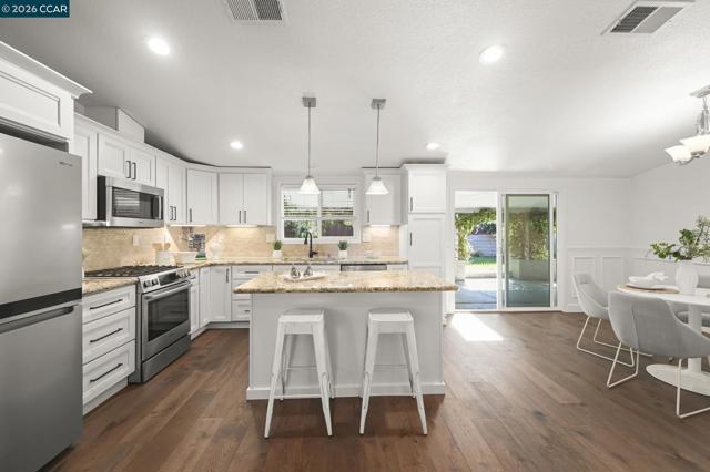 Updated, Eco-Friendly, and Set in an Exclusive Location! Welcome to turnkey, single story living where the major upgrades are already done! Beat high energy prices with OWNED Solar plus an EV Charger. Thoughtfully updated, it's your perfect entry into a premier neighborhood. The home shines with a refreshed kitchen and modern baths, complemented by new engineered hardwood flooring and fresh paint. The real value lies in the big-ticket items: a new, energy-efficient roof and a fully owned NEM 2 solar system with an EV charger, promising years of low utility bills. Extras include a laundry room complete with washer and dryer, plus a climate controlled private office /yoga room in the garage. Situated on a nice-sized lot, the property boasts an expansive, level backyard perfect for entertaining and relaxation. Enjoy sunny afternoons on the covered patio, find shade in the charming gazebo, and harvest your own fruit from mature citrus and fig trees. The yard also includes ready-to-plant garden beds, a storage shed, and a play structure. Prime Concord location close to Lime Ridge, parks & trails, and amenities. Take a look at this rare opportunity to own in one of the best neighborhoods.