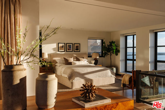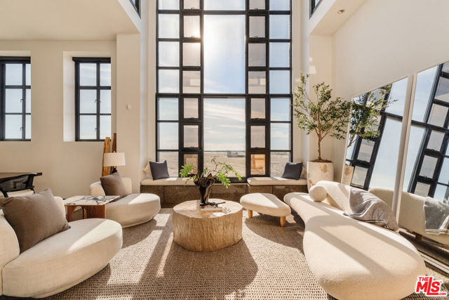 This iconic oceanfront residence in Marina del Rey is the epitome of premier coastal California living. Tucked within the ultra-private Marina Peninsula enclave, this extraordinary home delivers unrivaled serenity on a secluded stretch of the beach while staying close to the vibrant pulse of Venice Beach. Created by the renowned sculptor Robert Graham in close collaboration with dozens of iconic 1980s artists, this home integrates their extraordinary site-specific works throughout. The result is an irreplaceable living artwork, famously featured on the cover of Architectural Digest - a breathtaking fusion of ocean energy, marina views, and modern luxury. Enter through stunning stained-glass doors into open living and dining spaces bathed in natural light and filled with gentle sea breezes. A soaring two-story window with custom bronze accents frames panoramic beach views, creating heavenly tranquility within earshot of the ocean waves. The entertaining kitchen flows seamlessly into the dining room, anchored by a striking hand-blown Dale Chihuly chandelier, while a full secondary kitchen is tucked away discreetly in the back for effortless service and preparation. Ascend the architecturally pleasing staircase to a private office with tranquil ocean views and exquisite built-in cabinetry. Beyond lies the primary suite, a spacious and serene retreat with expansive floor-to-ceiling windows that invite abundant natural light and sweeping ocean vistas from sunrise to sunset. It includes refined etched Waterford crystal accents, automated shades, generous walk-in closets, a luxurious sauna-equipped bath, elevator access, and direct entry to the rooftop. The home is thoughtfully divided into two wings: the east wing houses the guest bedrooms, offering privacy and comfort, while the captivating secondary living room features a waterfall skylight, overhead mural, and angled marble floors. The private rooftop offers sweeping panoramas from Palos Verdes in the south to Malibu to the north across the Marina channel and Pacific to the west, all further enhanced by custom mosaics. Additional highlights and luxury amenities include a lower level with an informal theater or gym, powder room, and 4-car garage; a 4-stop elevator; mosaic lap pool; whole-house filtration; central vacuum system; and generator. Perfectly balancing the best of California beach charm with effortless access to world-class shopping, dining, entertainment, and travel, this home weaves an irresistible combination of art, nature, and sophisticated design into vibrant daily life. Your oceanfront sanctuary awaits.