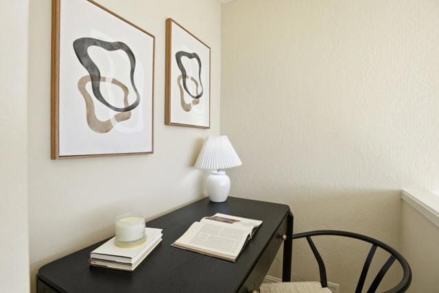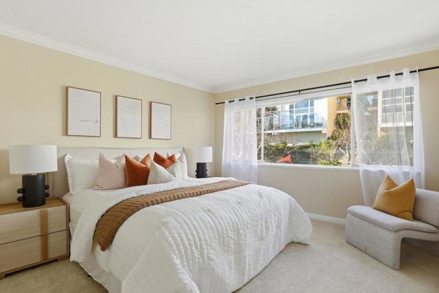 Nestled in the picturesque San Carlos Hills, this light-filled upper-level residence offers breathtaking panoramic views of the Bay and Silicon Valley. With soaring 18-foot ceilings and floor-to-ceiling windows, the home is bathed in natural light throughout its contemporary two-story layout. The spacious living area, equipped with a flexible dining room that can be converted into a third bedroom or home office, is complemented by a loft-style bedroom overlooking the living space, providing sweeping views. The main level features a cozy living room, a fully equipped kitchen, a dining area, a full bath, an in-unit laundry room, and a private balcony, perfect for enjoying peaceful days with frequent sightings of deer and hummingbirds. For added comfort, the home is equipped with a Nest thermostat, a new furnace, and cellular electric blinds. Residents have easy access to nearby trails and a dog park, while still being close to top-rated San Carlos schools, charming downtown shops and dining options, major tech campuses, Caltrain, and highways. The property includes two deeded parking spaces, with HOA amenities covering water, a tranquil pool, and serene walkways within an intimate 36-unit community.