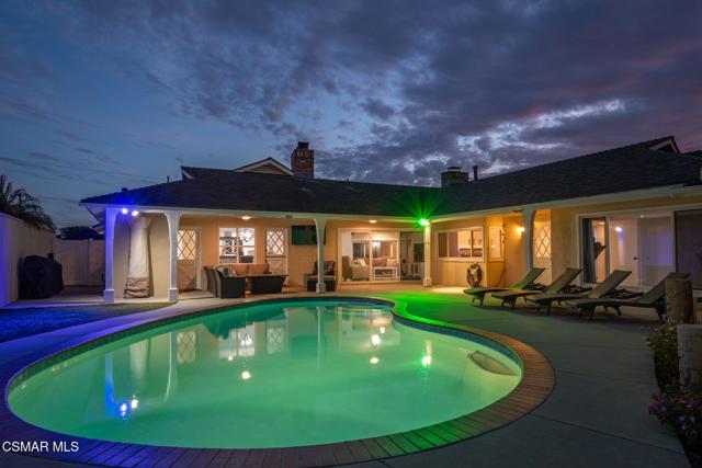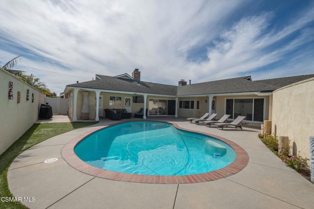 Welcome to this exceptional single-story home in the highly desirable Carriage Estates neighborhood of Oxnard -- a peaceful, walkable community known for its pride of ownership, friendly atmosphere, and quiet streets. This residence is anything but ordinary. Fully upgraded and filled with character, it offers warmth, charm, and distinctive features rarely found in today's homes. Fabulous curb appeal with the winding brick walkway and a patio area, beautiful, beveled glass door with sidelights. Rich brick fireplaces anchor the two living spaces, creating inviting rooms designed for gathering and connection. The dining area is truly one-of-a-kind, showcasing a built-in BBQ and rotisserie that transforms everyday meals into memorable experiences. Custom built-ins throughout, including a beautiful china cabinet and abundant storage, paneled walls and a dutch door, blend timeless style with practical living. Floors are neutral colored wood like which will blend with any color palette. Spacious bright and light upgraded kitchen with lots of windows and a cozy breakfast area. Warm toned granite counters, upgraded appliances, resurfaced cabinetry, new doors and drawer facing, newer sink and plumbing, exhaust fan as well with hood in cooktop, oven and microwave. Plenty of space for entertaining and gathering with friends and family all around the kitchen. Laundry area is a true large spacious room with sink and sewing counter and a bathroom with shower which makes it so convenient. This home also has two designated living areas, large family room and a cozy den which is perfect for gatherings. Primary retreat is fabulous with newer closet doors lots of room in closet and nicely remodeled bathroom. Secondary bedrooms are also spacious, one perhaps for an office. Custom built in area that is so well thought out and different for more storage. Remodeled spacious secondary bathroom with double vanities, shower and tub. Natural light pours in through plentiful windows, while four separate doors open to the backyard, creating seamless indoor-outdoor flow. The covered patio with recessed lighting is a perfect place to entertain. Plenty of outdoor space for relaxing by pool and a tranquil fountain, backyard speakers provide the perfect setting for relaxing evenings or effortless entertaining. Sparkling pool newly replastered with new light and split drains. Low maintenance home as well with synthetic turf in back. Large Shed has pool equipment so its out of your way. 2 car garage with extended length and built-ins with easy access to home. Close to shopping, parks and schools, the location is fabulous. Charming, unique, and thoughtfully designed, this Carriage Estates home offers comfort, personality, and a lifestyle that truly stands apart. Ahhh... Southern California living!