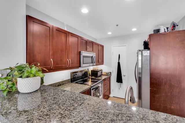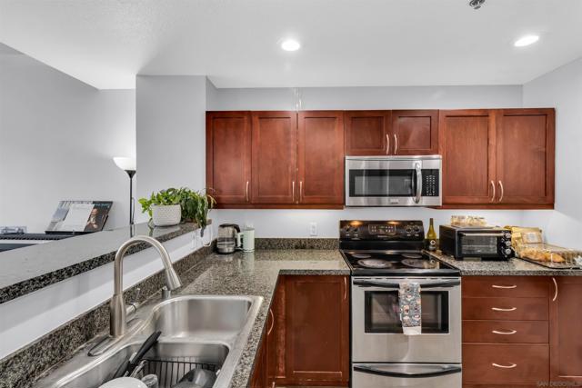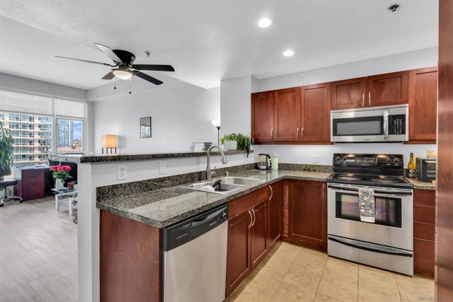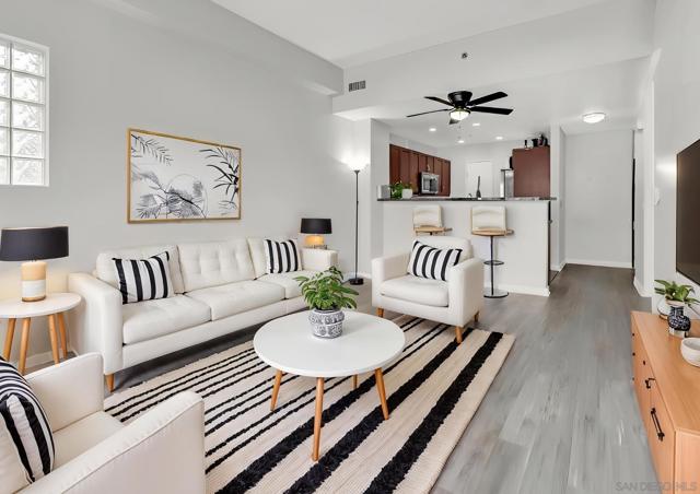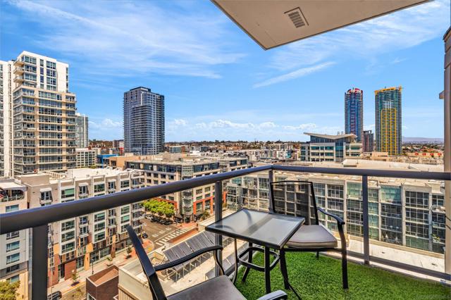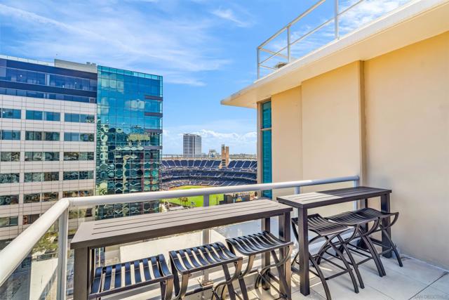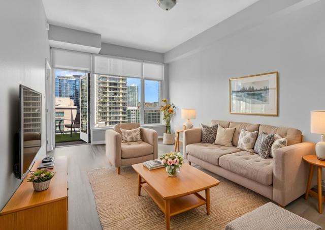 Welcome to this beautifully appointed residence in the heart of downtown San Diego’s East Village. This bright and modern condo offers a perfect blend of comfort and urban sophistication. Step inside to find an open-concept living space with large windows that fill the home with natural light and showcase breathtaking city views. The contemporary kitchen is equipped with granite countertops, stainless steel appliances, and rich wood cabinetry, making it ideal for both cooking and entertaining. The spacious living area flows seamlessly to a private balcony—perfect for enjoying morning coffee or evening sunsets while overlooking the vibrant city skyline. The bedroom retreat features ample closet space, while the bathroom is tastefully designed with granite counters and modern finishes. This secure, amenity-rich building offers everything you need for a dynamic downtown lifestyle, including a rooftop deck with BBQs and lounge areas, a fitness center, and inviting common spaces. Located steps away from Petco Park, top-rated dining, nightlife, and shopping, this home is an unmatched opportunity to live in one of San Diego’s most desirable urban neighborhoods. Don’t miss your chance to own a piece of downtown luxury living!