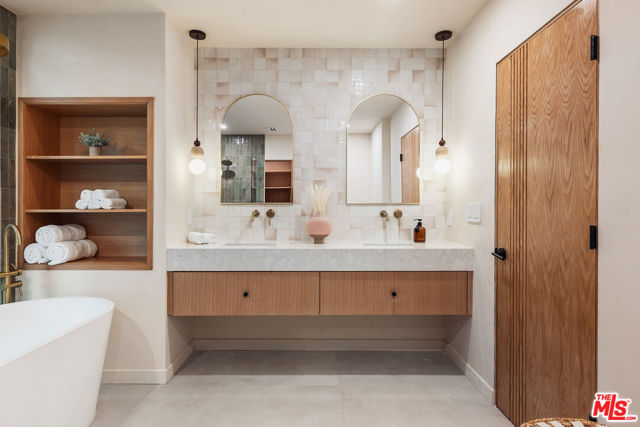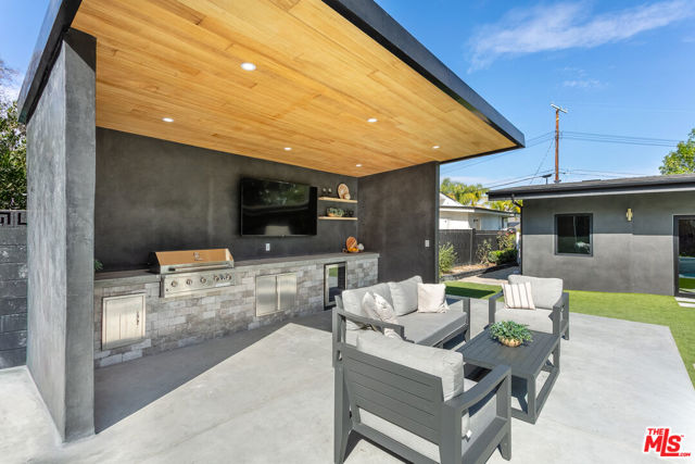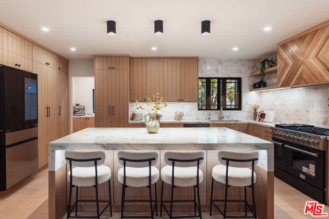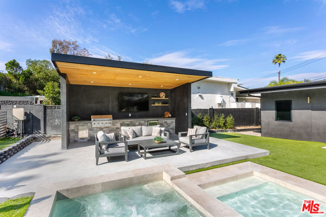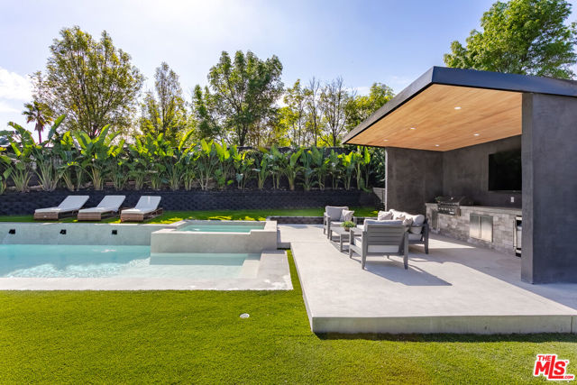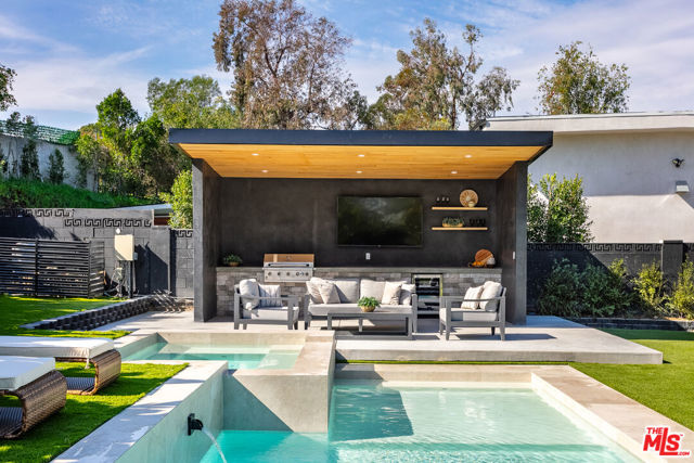 Welcome to this impeccably reimagined Mid-Century Modern residence by renowned architect Charles Du Bois, where organic modern design meets elevated contemporary living in the heart of Woodland Hills. Set on an expansive 12,000-square-foot lot, this 3,052-square-foot architectural showpiece offers five bedrooms, three bathrooms, and a seamless indoor-outdoor lifestyle curated for modern luxury. The interiors unfold through a light-filled, open-concept floor plan highlighted by soaring vaulted wood ceilings, exposed beams, curated lighting, and a striking double-sided fireplace that anchors the living spaces with warmth and sophistication. The chef's kitchen is both refined and functional, featuring stainless steel appliances, sleek marble countertops, and custom cabinetry ideal for intimate gatherings and elevated entertaining alike. The primary suite serves as a serene retreat, complete with a spa-inspired bath and two generous walk-in closets. Additional bedrooms are thoughtfully designed to offer flexibility, comfort, and style. This residence has been comprehensively updated with all major systems fully replaced, including new plumbing, electrical, roofing, and mechanical systems, offering modern efficiency and peace of mind alongside its timeless design. Outdoors, the property transforms into a private resort. Enjoy a newly constructed pool, a covered cabana with a fully equipped outdoor kitchen, and lush, manicured grounds that provide exceptional privacy and tranquilityperfect for entertaining, relaxing, or enjoying everyday California living. Ideally located moments from Calabasas' premier dining and shopping and within a highly regarded school district, this exceptional offering delivers a rare blend of architectural pedigree, modern luxury, and an enviable lifestyle.