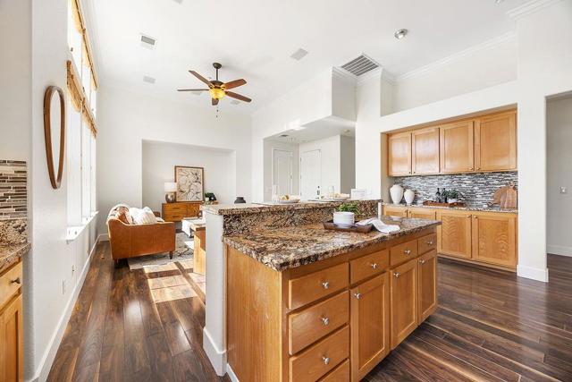 Perched in the desirable Monte Vista Villas (near Oakland Hills), this bright corner-unit condo offers sweeping hillside views and a comfortable, well-designed living experience. Featuring 3 bedrooms and 3 bathrooms, including two primary suites, this home offers a thoughtfully designed layout ideal for both everyday living and effortless entertaining. This beautifully appointed home feels light and airy, with expansive windows, high ceilings, and attractive flooring throughout. The open floor plan seamlessly connects the kitchen, dining, and living areas, creating a natural flow. The kitchen features granite countertops, a full backsplash, gas range, breakfast bar, and stainless steel appliancesideal for casual meals or hosting. The living room offers crown molding, recessed lighting, and tall ceilings, creating a warm and inviting space. Two spacious primary suites include large walk-in closets and well-appointed bathrooms, providing flexibility for guests or work-from-home needs. Additional highlights include in-unit laundry, a two-car garage, and private patios. Conveniently located near the community park, clubhouse, and gym, with easy access to major freeways and AC Transit.