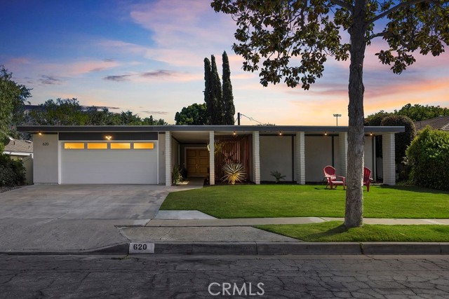 Stylish, striking and exuding an understated cool vibe, this stunning mid-century modern residence is sure to impress, welcome to 620 E. Glenwood Avenue. Tucked into a quiet, tree lined cul-de-sac; crisp, sharp architectural details are complimented by a lush, tropical landscaped entryway. Double doors lead into a spacious, meticulous and FRESHLY PAINTED interior with wood flooring throughout the living areas and main hallway. The striking fireplace is balanced by two large windows overlooking the manicured backyard, the spacious living room flows perfectly into the formal dining room with stylish chandelier and a sliding door to the backyard and patio. A remodeled and perfectly appointed kitchen features quartz counters with a contrasting wood breakfast bar, a full suite of KitchenAid SS appliances including a 5-burner gas cooktop, side-by-side fridge and quality shaker white cabinetry. A breakfast nook, ½ guest bathroom and direct garage access complete this side of the home. Down the light filled hallway with skylight, double doors lead into a surprisingly spacious primary suite with dual closets, one a walk in, and a sliding door to the backyard. The en-suite has been remodeled with a perfect mid-century modern style featuring custom tile flooring and shower enclosure and a beautiful dual sink vanity. Three secondary bedrooms with new carpet and an updated full bathroom are found as you continue down the hallway. The private and stylish backyard enjoys a wood slat patio and great horizontal fencing detail. Owned, fully paid off 3.6 Kw SOLAR system too. 7 year old membrane GTA roof too! Water heater is 1 year old. Don’t miss this spacious and stylish home – it likely won’t remain on the market long.
