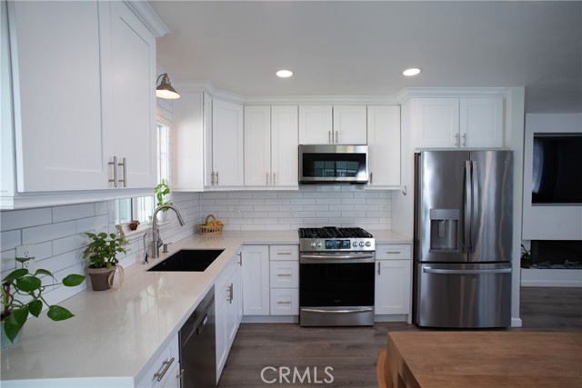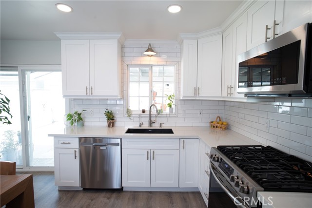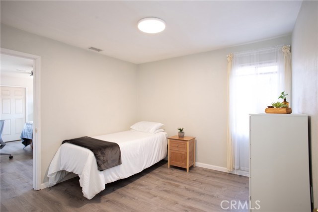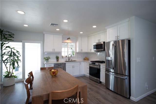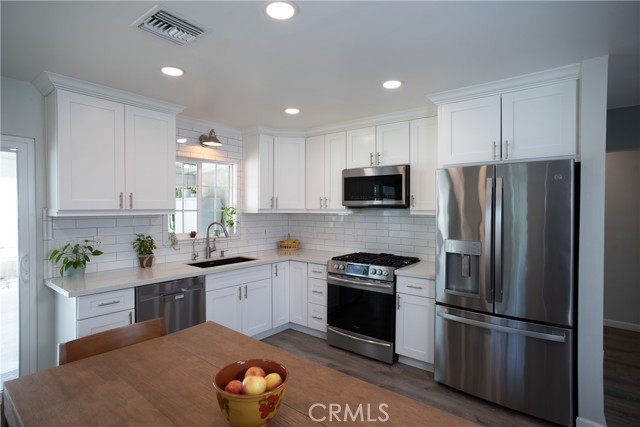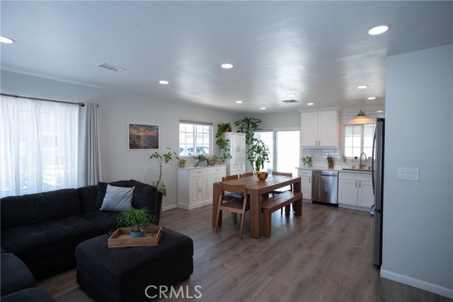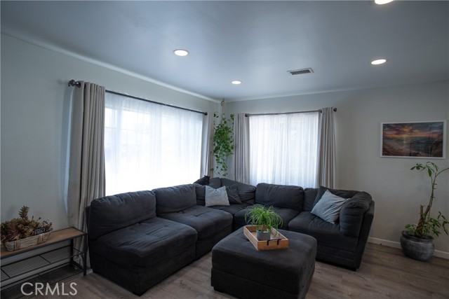 Beautiful and spacious 4-bedroom, 2-bath turnkey home in Whittier featuring thoughtful upgrades, a versatile layout, and abundant natural light throughout. The open floor plan creates a seamless flow between the living, dining, and kitchen areas, complemented by laminate flooring and a freshly painted interior. The kitchen has been updated with quartz countertops, updated cabinets, modern appliances, dual-pane windows, and a sliding glass door that provides access to the backyard. The hallway bathroom has been renovated and features a walk-in shower and an updated vanity. The home offers generously sized bedrooms, including an expansive back bedroom suite with its own bathroom, walk-in closet, and private entrance, ideal for extended family, guests, or a rental. Additional features include solar, a newer AC system, and a water softener. The detached garage includes a built-in bar, creating a great space for entertaining and offering potential for an ADU conversion. The driveway provides ample off-street parking for up to three cars or an RV. The backyard is designed for low-maintenance living with decomposed granite and drought-tolerant landscaping. Conveniently located near the Whittier Greenway Trail and major freeways, this move-in-ready home offers easy access to outdoor recreation, commuting, and shopping.