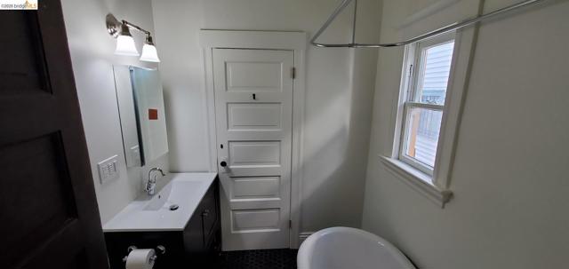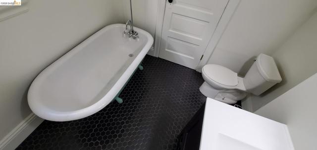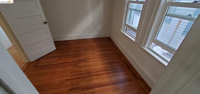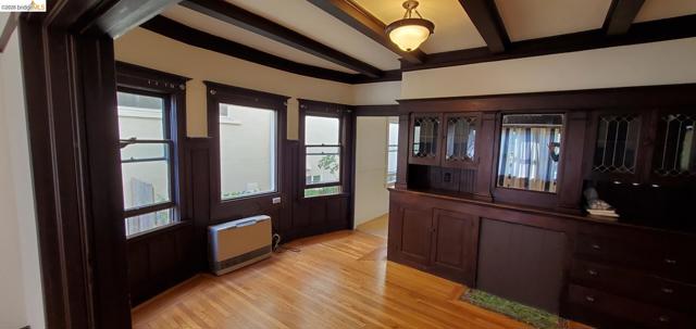 Bright, open, and updated 1+ bedroom flat in Bushrod available May 15. This is an approximately 850 square foot, lower flat in a 1910 Classic Box duplex with tall ceilings, original period details including box beams, wainscotting, coved ceilings, and recent eco-conscious modernizations. The living room has the original sliding pocket doors allowing for flexible use as office or guest room. The kitchen has been modernized with natural marmoleum flooring, some newer cabinets, stainless steel and quartz countertops, an induction range, and an exhaust hood. The bathroom has been recently remodeled with new sink and vanity, new tile floor, high quality clawfoot tub shower hardware, whisper quiet exhaust fan, and electric towel warmer. The flat is heated with an efficient gas wall heater. Hot water is provided by a recently installed heat pump water heater. Super central location for commuters with multiple BART station options and proximity to 580/24.