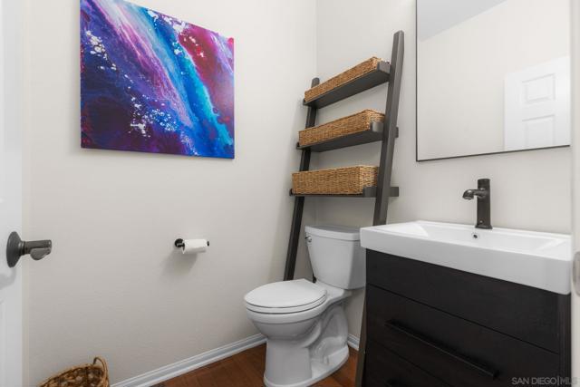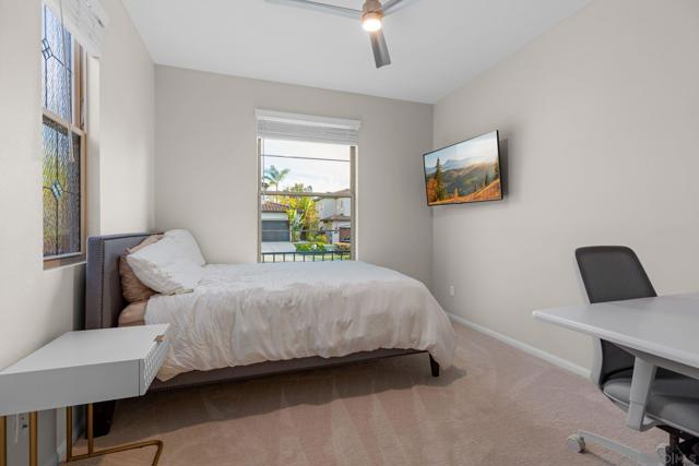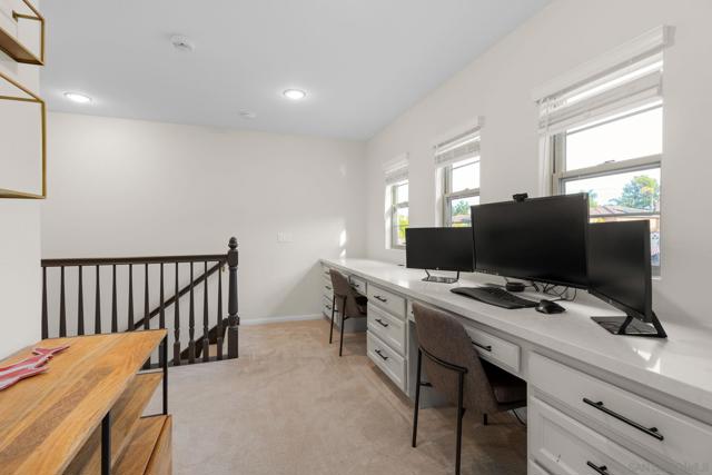 Homes with this level of flexibility and finish rarely come available in Avalon Point, one of Rancho Peñasquitos’ most desirable neighborhoods. Ideally situated on a quiet cul-de-sac street, this thoughtfully designed residence offers both privacy and convenience, with easy freeway access and a central location equidistant to major employment hubs in Sorrento Valley and Rancho Bernardo. Designed for both everyday living and effortless entertaining, the home features a private junior suite on the main level, three additional bedrooms upstairs, and a versatile loft with an updated tech center and dual built-in workstations—ideal for today’s remote or hybrid lifestyle. From the moment you enter through the custom front door, the home impresses with its modern aesthetic—soft neutral paint, crisp white trim, dramatic living room beams, rich wood flooring, new blinds throughout, dual-pane windows, and smart-home enhancements. The updated kitchen shines with a full designer backsplash and stainless steel appliances, while owned solar enhances efficiency. Outdoor living is elevated with a resort-style backyard featuring a fire pit, low-maintenance turf, and space designed for both relaxation and gathering. Upstairs, the primary retreat offers serene views, dual walk-in closets, and a spa-like ensuite bath finished in custom tile. A three-car tandem garage provides exceptional storage with built-in cabinetry and epoxy-coated floors. With a prime location near schools, parks, trails, dining, and shopping, this home offers a unique blend of luxury, functionality, and convenience. VA assumable loan.