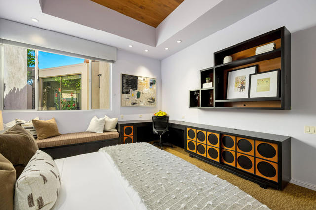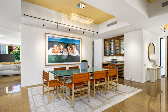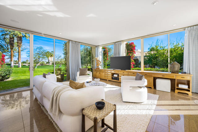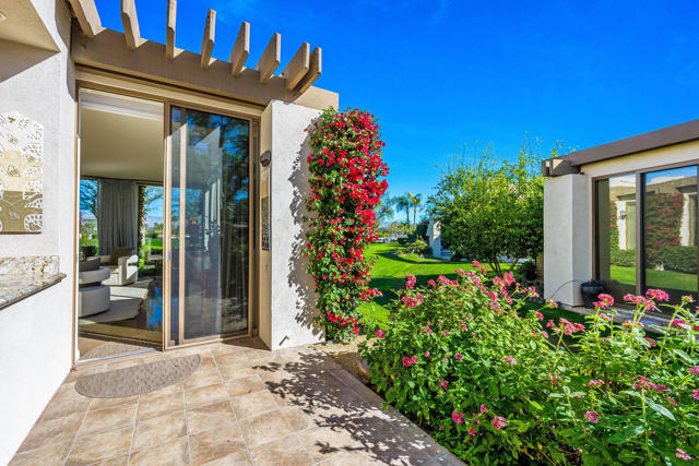 An expanded and all one-level Cottage is listed and available for a quick closing. The 2,887 square foot floor plan of this Cottage offers three bedrooms and three bathrooms with gourmet-style kitchen open to the living/family room with views to the Desert Course. Like other A' Plan Cottages, the two-car and single-cart garage is attached for easy access to the residence. More unique is its cul-de-sac location which allows for a spacious sweeping driveway that can accommodate guest parking when friends and family come to visit. This Cottage is directly across from the community pool/spa entertainment area and is within easy walking distance to the Club's amenities.Remodeled and update around a decade ago, the designer incorporated modern ceiling details, warm woods, and natural stone flooring and countertops. Professional lighting was put in place to heighten the viewing experience of the owner's art collection. The gated entry courtyard with string lighting is large and offers a private space for dining and relaxing. The seller has included two sculptured glass flower gardens and a collection of outdoor art sculptures that are included in the purchase price. With the structural work done, this Cottage offers the ability for the buyer to purchase, redecorate, furnish, and enjoy their new home as the season opens this fall.