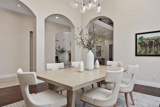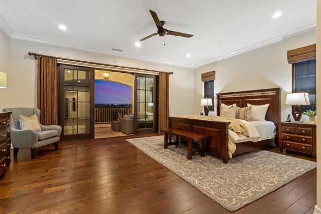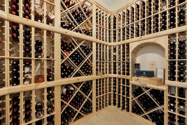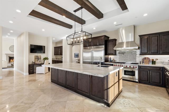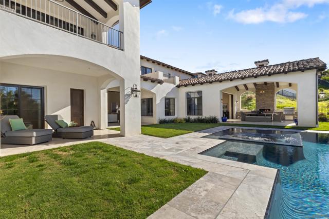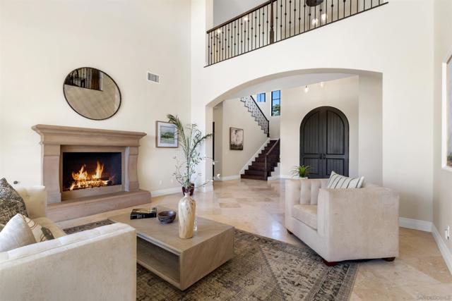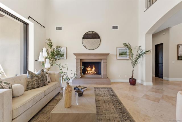Absolutely stunning custom estate completed in 2022—among the newest homes in the prestigious Crosby at Rancho Santa Fe. Ideally located on a quiet, beautifully curated street of luxury residences within the highly rated Solana Santa Fe (K–8) and Torrey Pines High School districts, and near top private academies. Designed by local architect Scott Grunst, this 6,523 sq. ft. residence blends timeless elegance with modern luxury. A dramatic 22-foot foyer sets the tone with soaring arched windows, hardwood floors, exposed solid wood beams, and a grand staircase with wrought-iron railings. The chef’s kitchen is equipped with an eight-burner Wolf range with infrared charbroiler, 64" Electrolux refrigerator/freezer, double Electrolux dishwashers, custom stained alder cabinetry, and Brazilian quartzite countertops. Entertain effortlessly with a full wet bar featuring a built-in kegerator and a custom, climate-controlled 800-bottle wine cellar with additional storage. Disappearing pocket doors create seamless indoor-outdoor living, opening the main living space to a covered loggia with fireplace, full outdoor kitchen, and Wolf BBQ. The resort-style backyard offers exceptional privacy with no close neighbors and showcases a rim-flow PebbleTec® pool, vanishing-edge spa, raised fire pits, and unobstructed sunset views over a protected natural preserve. The thoughtful floor plan includes an elegant executive office on the main level with built-ins and fireplace, a main-level guest or secondary primary suite ideal for multigenerational living, and a spacious upstairs primary retreat. Upstairs also features two additional ensuite bedrooms and a game room overlooking the living room below. Additional highlights include an owned solar system, oversized motor court, and a four-car garage configuration: attached two-car garage with Tesla charger plus a detached, insulated two-car garage with A/C wiring—ideal for a gym, studio, or yoga space. Residents enjoy access to The Crosby’s Fred Couples-designed golf course, 35,000-sq.-ft. clubhouse, tennis and pickleball courts, Olympic-size pool, spa, fitness center, dining, and active social calendar. Conveniently located with quick access to Rancho Santa Fe Village via the north gate and Hwy 56, Hwy 15, and Hwy 5 via the south gate for beaches, shopping, and dining.