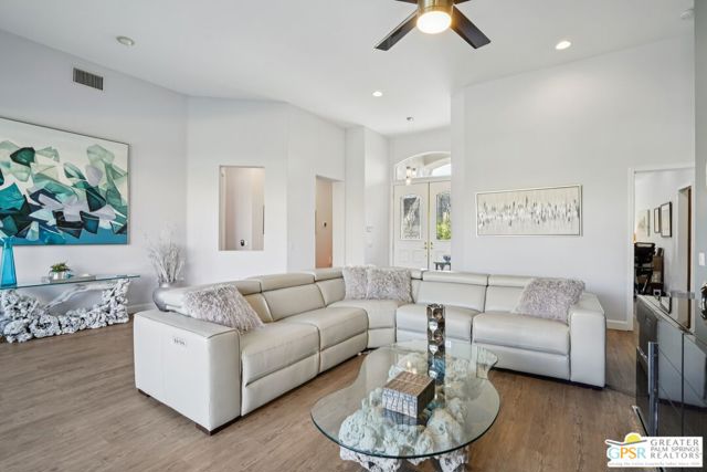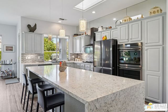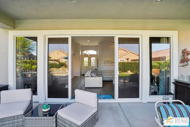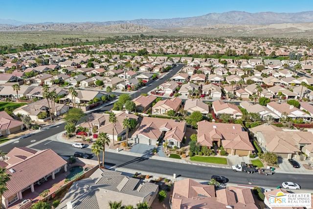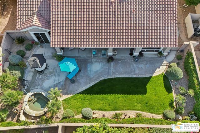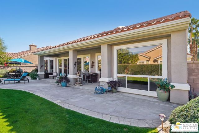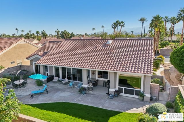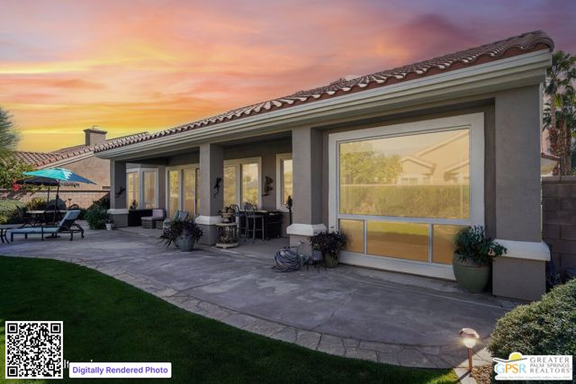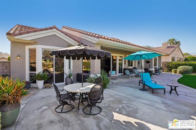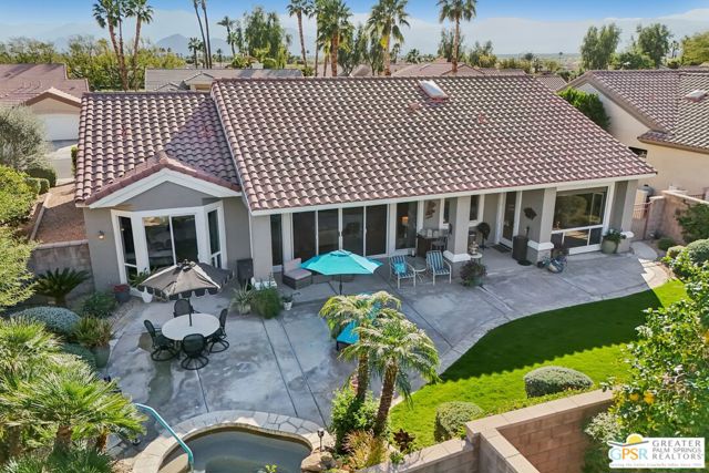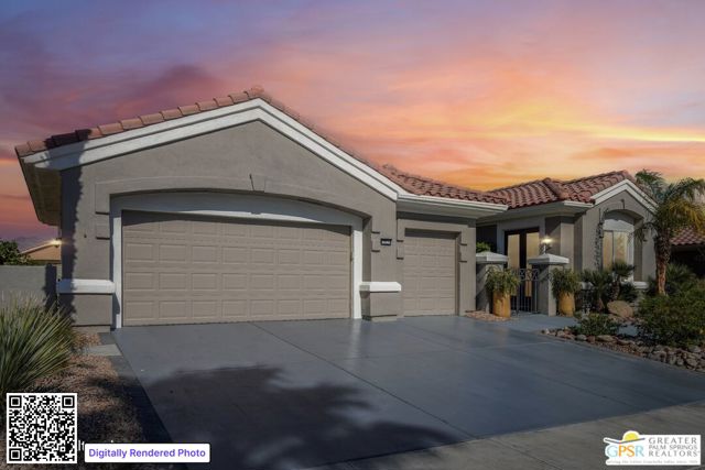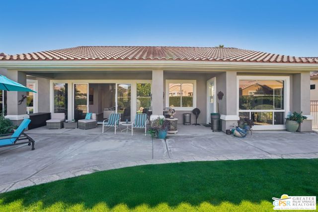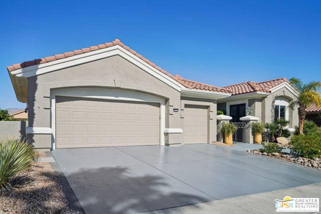 Set on a quiet street near the Sunset View Clubhouse, this upgraded 3 bedroom, 3 bath extended Monaco with extended garage offers over 2,500 sq ft of versatile desert living inside Del Webb Sun City Palm Desert, one of the country's most sought after 55+ communities. The light filled great room opens to a private backyard with lawn, spa, and waterfall, creating a true indoor-outdoor retreat. The open kitchen and family room feature a large center island and casual dining area ideal for entertaining or everyday comfort. The primary suite includes a very spacious walk-in closet, large bathroom closet with plenty of storage, and beautiful spa-style shower. Two additional suites, each with their own private access, offer exceptional flexibility for guests, a home office, or income-producing casitas. Additional highlights include a laundry room, oversized two car garage, plus a dedicated golf cart garage. Residents enjoy access to two championship golf courses, resort-style pools, a modern fitness center, walking trails, clubhouses, dining, and endless social activities, all within a beautifully maintained, guard gated community. This is relaxed, resort-style desert living at its finest. Furnishings available outside of escrow