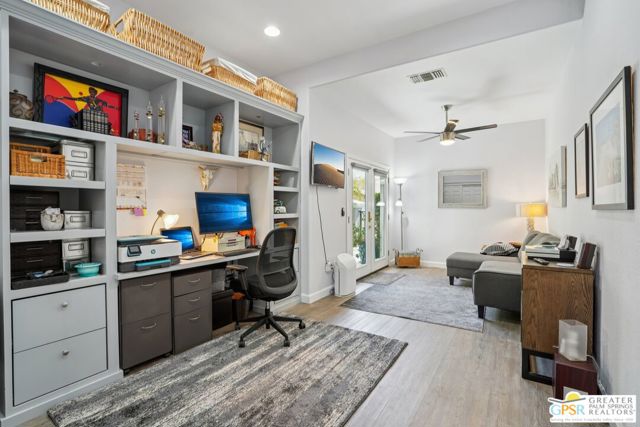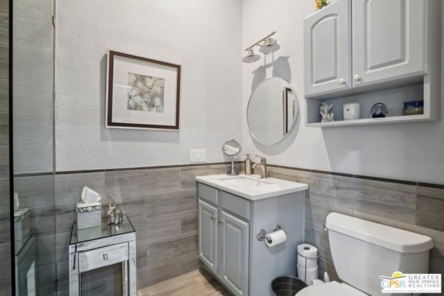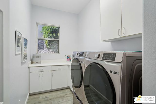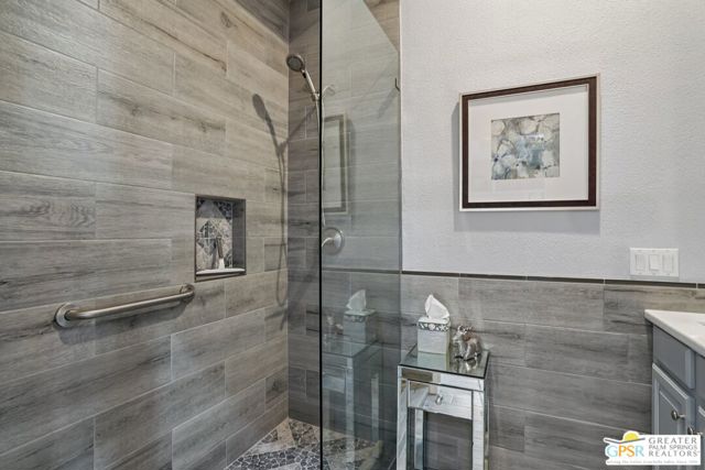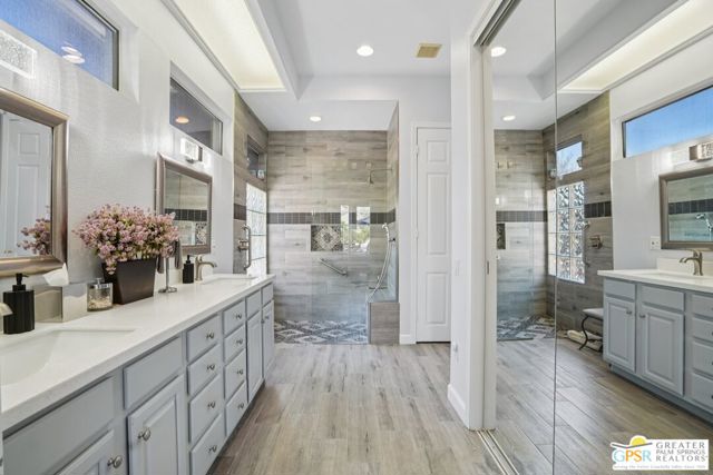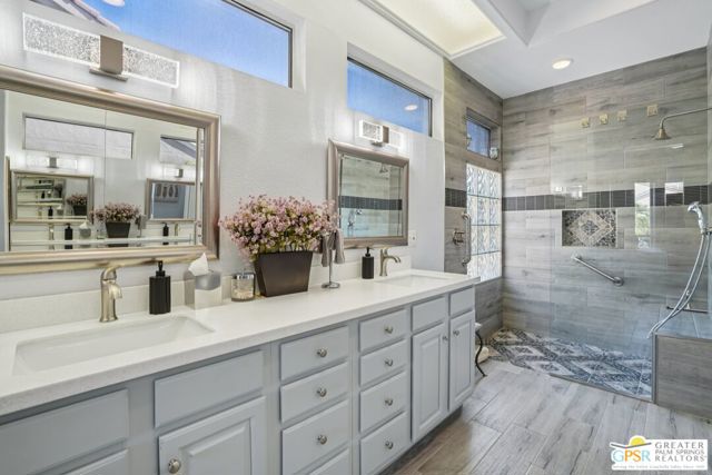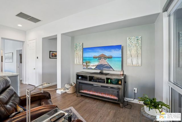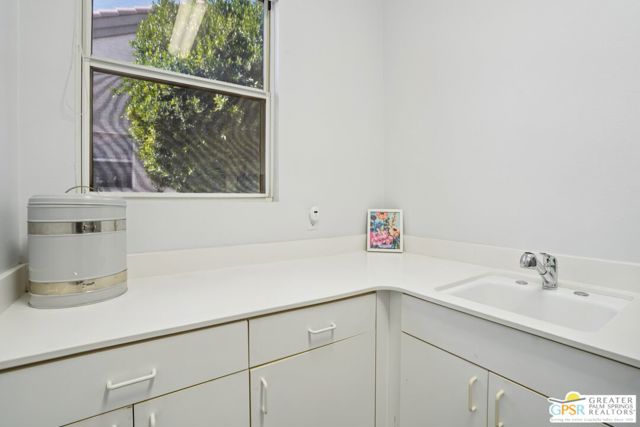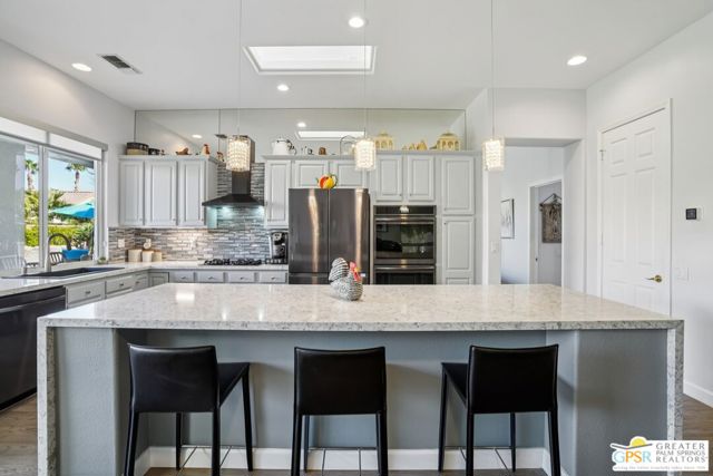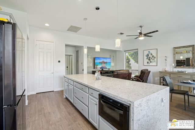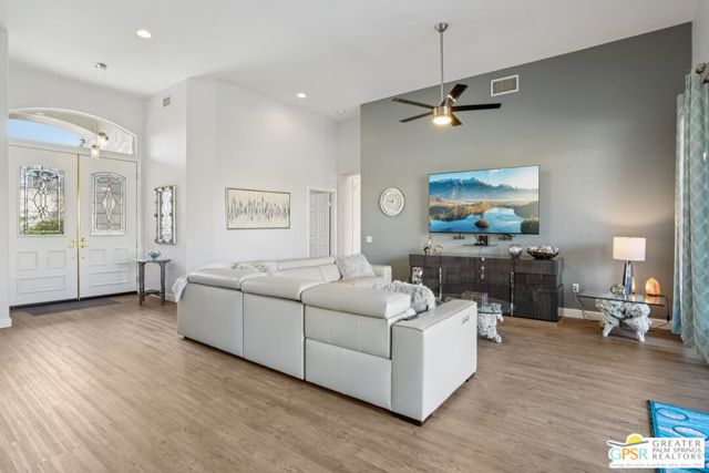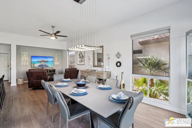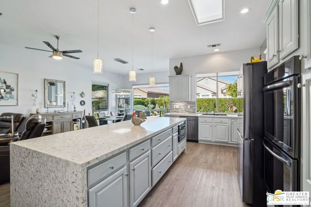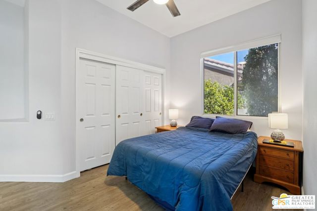 Set on a quiet street near the Sunset View Clubhouse, this upgraded 3 bedroom, 3 bath extended Monaco with extended garage offers over 2,500 sq ft of versatile desert living inside Del Webb Sun City Palm Desert, one of the country's most sought after 55+ communities. The light filled great room opens to a private backyard with lawn, spa, and waterfall, creating a true indoor-outdoor retreat. The open kitchen and family room feature a large center island and casual dining area ideal for entertaining or everyday comfort. The primary suite includes a very spacious walk-in closet, large bathroom closet with plenty of storage, and beautiful spa-style shower. Two additional suites, each with their own private access, offer exceptional flexibility for guests, a home office, or income-producing casitas. Additional highlights include a laundry room, oversized two car garage, plus a dedicated golf cart garage. Residents enjoy access to two championship golf courses, resort-style pools, a modern fitness center, walking trails, clubhouses, dining, and endless social activities, all within a beautifully maintained, guard gated community. This is relaxed, resort-style desert living at its finest. Furnishings available outside of escrow