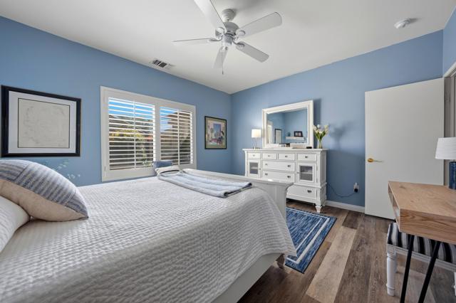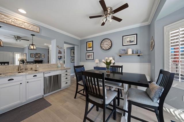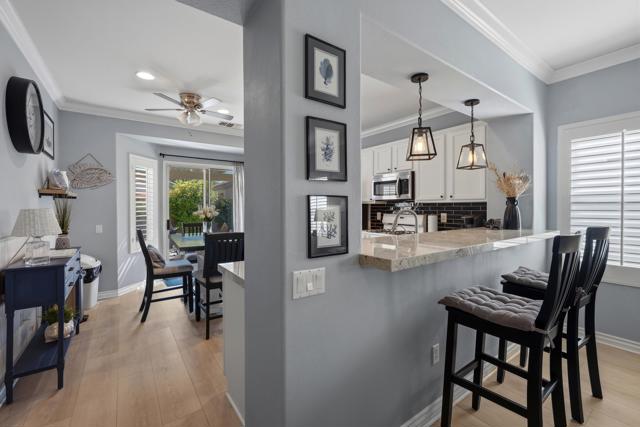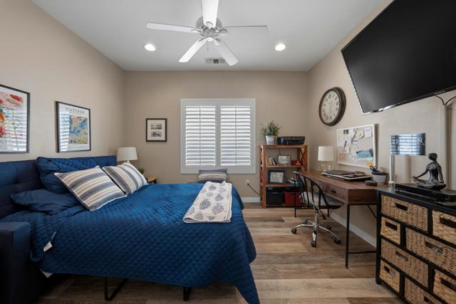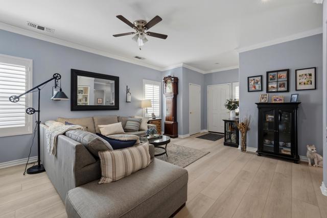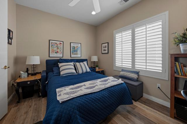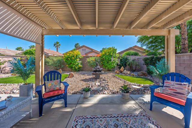 Sun City Palm Desert - Pasadena. This beautifully updated and upgraded greatroom home offers a bright, open layout and an ideal location just a short distance to the neighborhood pool and the convenient golf cart gate to the Stater Bros. shopping center. Major systems have been thoughtfully updated, including the AC, furnace, and water heater (all new in 2025), providing peace of mind for years to come. The south-facing rear yard is a true highlight--beautifully landscaped with an extended patio, alumawood patio cover, and low-maintenance artificial turf, creating the perfect space for relaxing or entertaining. Inside, the home showcases quality upgrades throughout. Luxury vinyl plank flooring runs through the main living areas, while the bedrooms feature engineered wood. Five-inch baseboards and plantation shutters are installed throughout, adding a refined touch. The greatroom is enhanced with crown molding and a custom built-in media center. The kitchen is both stylish and functional, featuring granite countertops, pendant lighting over the breakfast bar, crown molding, and decorative wainscoting along the side wall. The primary suite includes a spacious walk-in closet with built-in storage, and its bathroom has been upgraded with a custom tile stall shower and glass enclosure. The guest bathroom offers a convenient tub/shower combination. The finished garage provides additional value with built-in storage and ample space for organization. This home blends thoughtful upgrades, comfortable indoor living, and inviting outdoor space--all in a prime Sun City Palm Desert location.