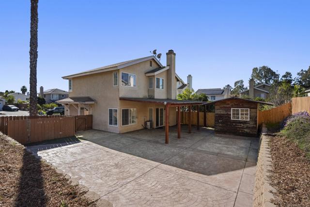 Welcome to this beautifully renovated Paradise Hills home, tucked away on a quiet cul-de-sac. The newly landscaped front yard offers ample space, including two guest parking spots alongside the garage and driveway. Inside, enjoy fresh interior paint, new stairs, and plank-wood flooring throughout the entire upper level. The primary bedroom features two side-by-side rooms that can be combined into one larger space. A cozy fireplace warms the family/dining room, which sits just off the open kitchen with granite countertops and some new appliances. Step outside to a super-sized backyard designed for entertaining, complete with a covered patio and a large shed ideal for an art studio, exercise room, or storage. A built-in trash bin station adds extra convenience. Beautiful upgrades, generous outdoor space, and a quiet cul-de-sac location make this home a standout.
