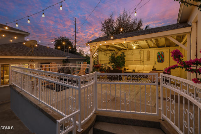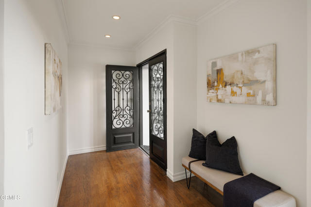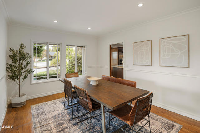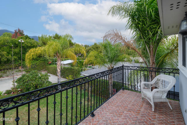 Located on a corner lot in a desirable La Canada Flintridge neighborhood, this beautifully updated two-story Colonial blends timeless architecture with comfortable living spaces and modern updates, all within one of the area's most sought-after school districts. Double front doors open to a warm interior where hardwood floors, crown molding, and recessed lighting create a classic and inviting atmosphere. The formal living room features a traditional fireplace framed by built-in shelving and a charming bay window overlooking the lush front yard. Adjacent, the dining room flows seamlessly into a beautifully remodeled kitchen with granite countertops, custom cabinetry, and stainless-steel Miele appliances, including a gas cooktop, oven, range hood, and dishwasher. A cozy breakfast nook with bay window and built-in bench seating adds charm, while a side door opens to a covered porch for easy outdoor access. An arched opening leads to the spacious family room, highlighted by a second fireplace, wet bar, and laundry area hidden behind louvered doors. A hallway off the main living spaces connects to three comfortable downstairs bedrooms, two bathrooms, and generous storage. One bathroom features a glass-enclosed rain shower, while another offers a tub with a separate tiled shower. Up the hardwood staircase with wrought-iron detailing are three additional bedrooms, including the serene primary suite. The primary bedroom includes two walk-in closets with built-ins, dual-pane windows, and a ceiling fan. The ensuite bath offers a jetted spa tub, glass-enclosed shower, dual-sink vanity, stone flooring, and a private water closet with Toto toilet. The additional upstairs bedrooms share a full bath with dual sinks and enjoy access to a charming balcony overlooking the backyard. Outside, the expansive backyard offers multiple areas for relaxing and entertaining, including a grassy lawn surrounded by fruit and palm trees, a large concrete deck for dining or lounging, and an upper terrace ideal for recreation or a sports court. A covered patio and detached two-car garage add versatility. Conveniently located near local shops, dining, parks, and freeway access--and within the award-winning La Canada Flintridge school district--this home blends traditional character with thoughtful updates in a highly desirable setting.
